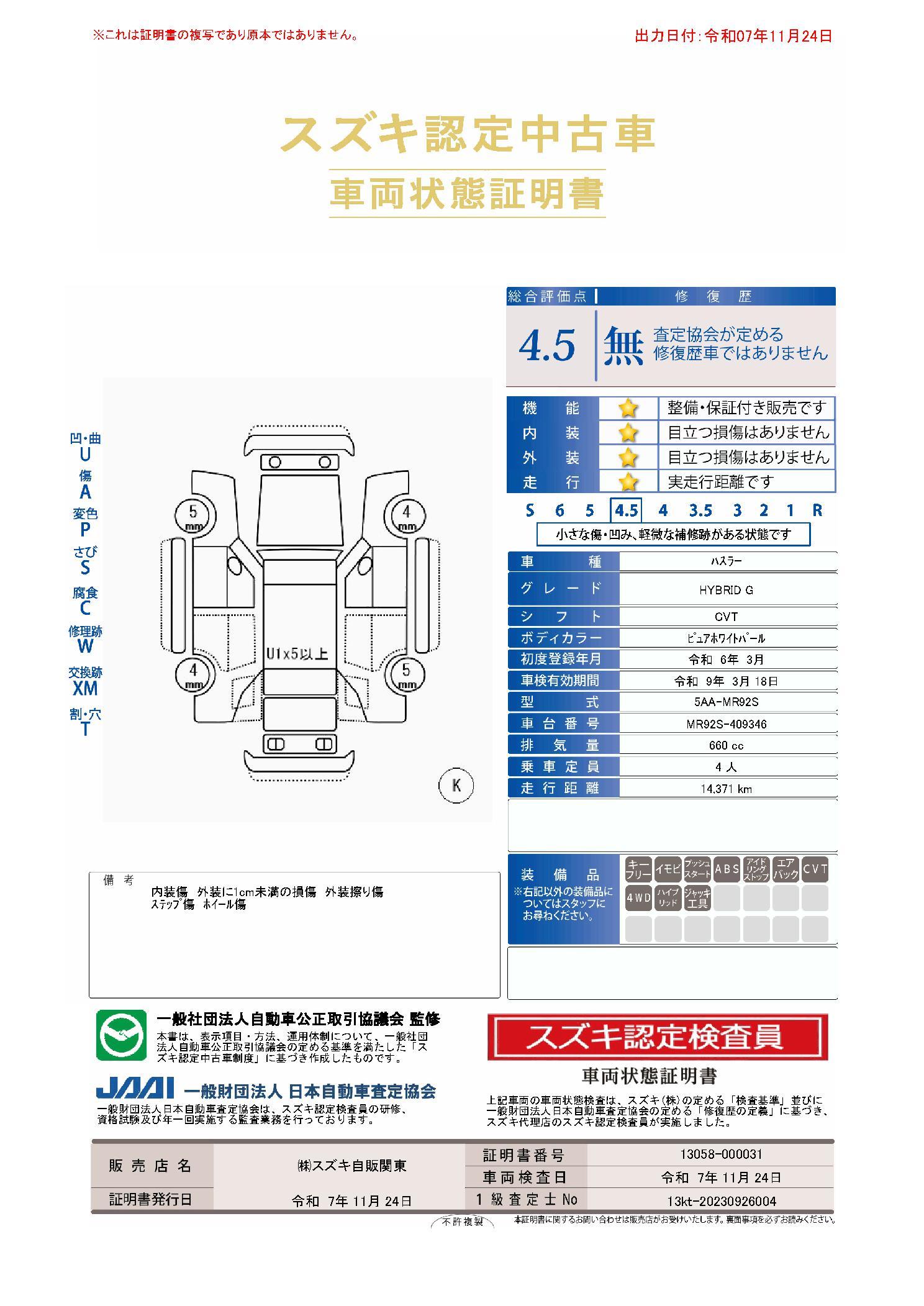 | 保証について | [保証付]:2027(令和9)年3月まで・60000km ※いずれか早い時期が保証適用の条件となります。 |