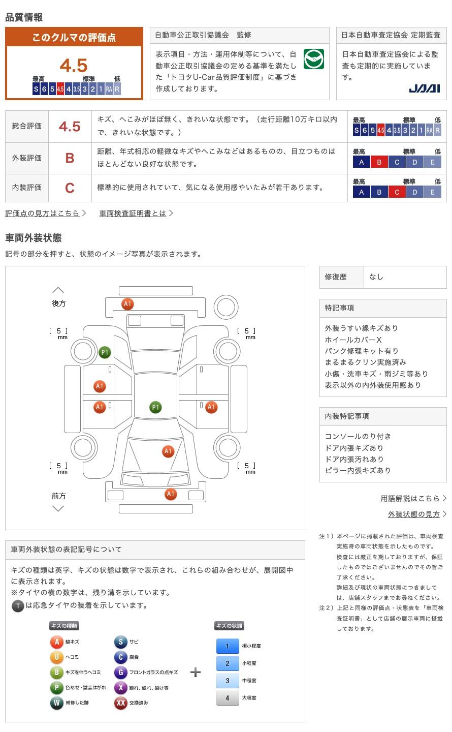 | 保証について | [保証付]:12ヶ月・走行無制限 1年間走行距離無制限のロングラン保証付!!全国5000店舗のトヨタ販売店にて保証修理可能です。別途有料にて最長3年までの保証延長が可能となります。 |