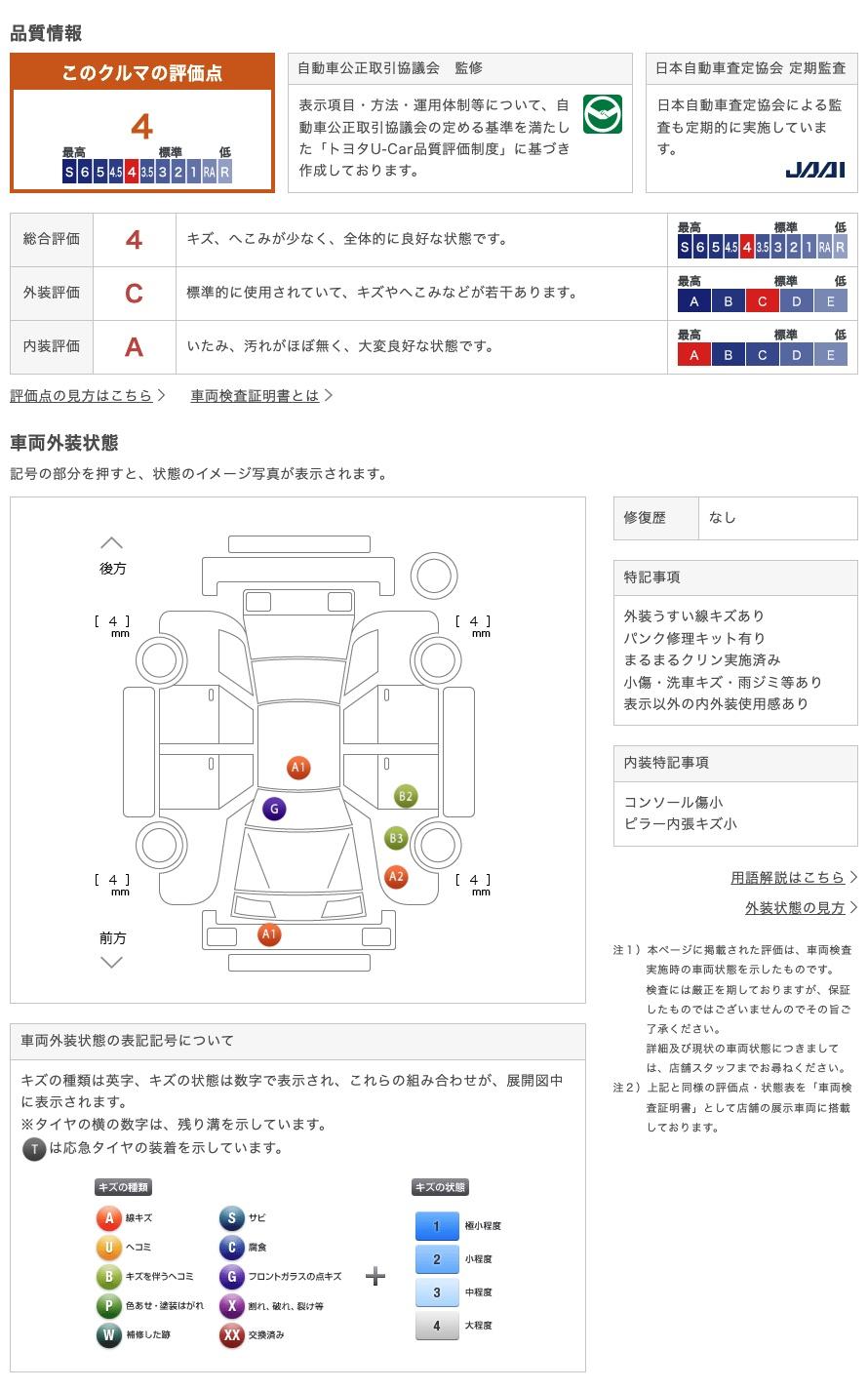 | 保証について | [保証付]:12ヶ月・走行無制限 1年間走行距離無制限のロングラン保証付!!全国5000店舗のトヨタ販売店にて保証修理可能です。別途有料にて最長3年までの保証延長が可能となります。 |