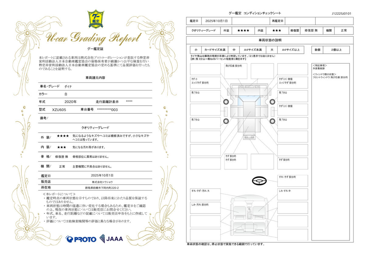納車日から1ヶ月間または1,000キロのいずれか早い方の期間の保証がついています。架装部分は保証対象外となります。また業者販売の場合、保証は対象外となります。