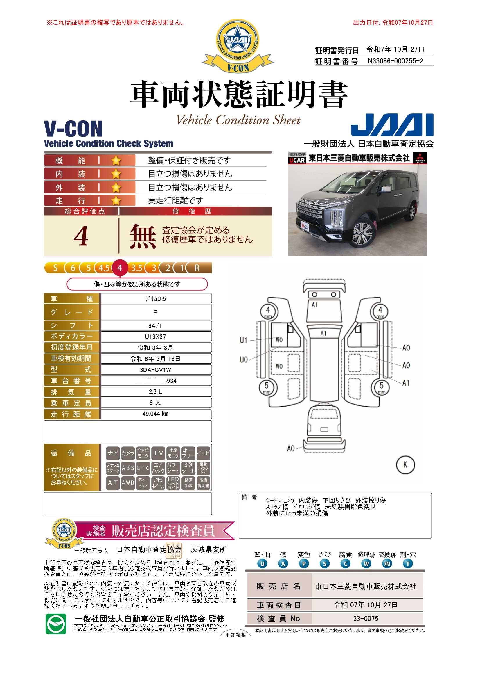 保証は、全国三菱ディーラー保証です。ナビゲーション等も保証の対象となる、ワイドな保証です。