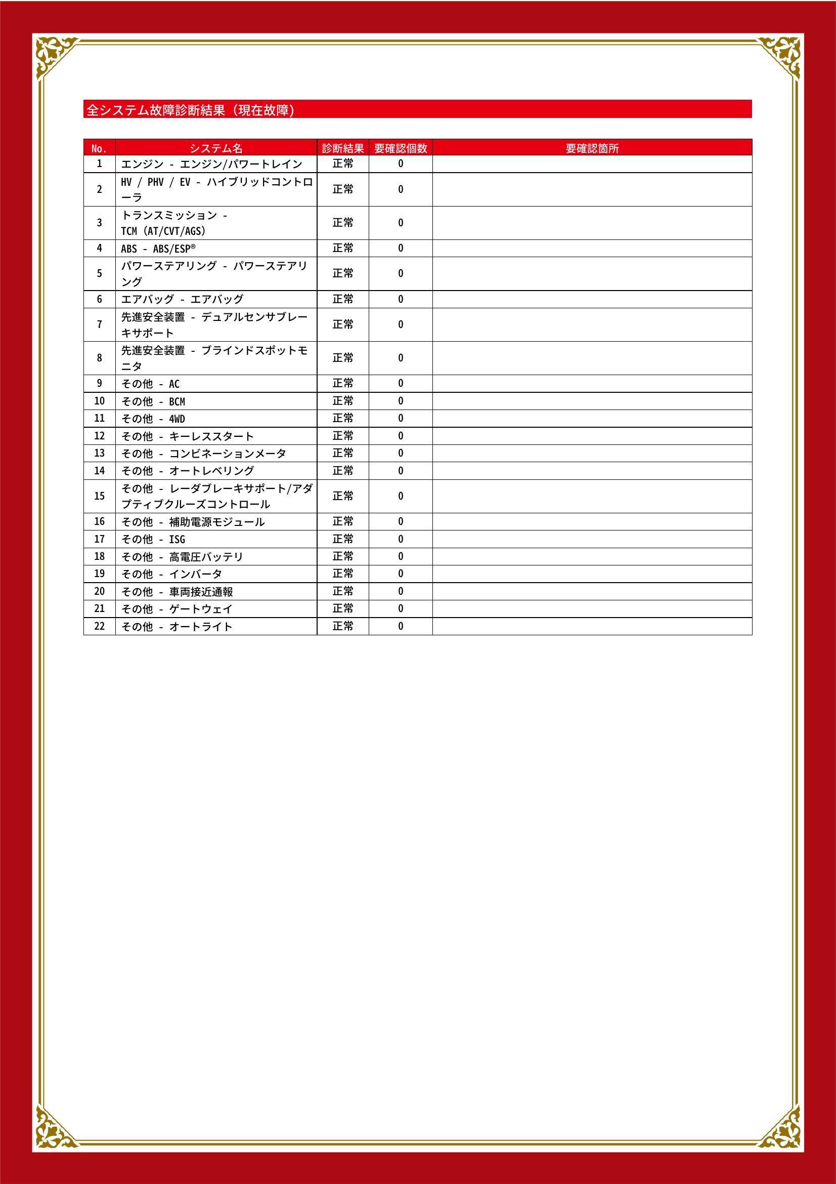 | 保証項目 | 納車後1ヶ月・1000km以内は36機構・343項目を保証いたします。詳しくは販売店までお問い合わせ下さい。 |