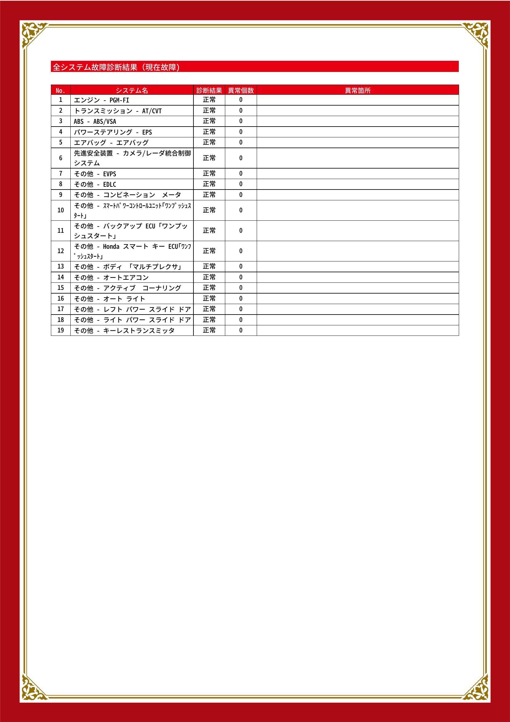 | 保証項目 | 3ヶ月・3000km以内ならエンジン、トランスミッション、ハイブリッド、ステアリング、ブレーキの各機構における主要項目を無償修理(または交換)いたします。 |