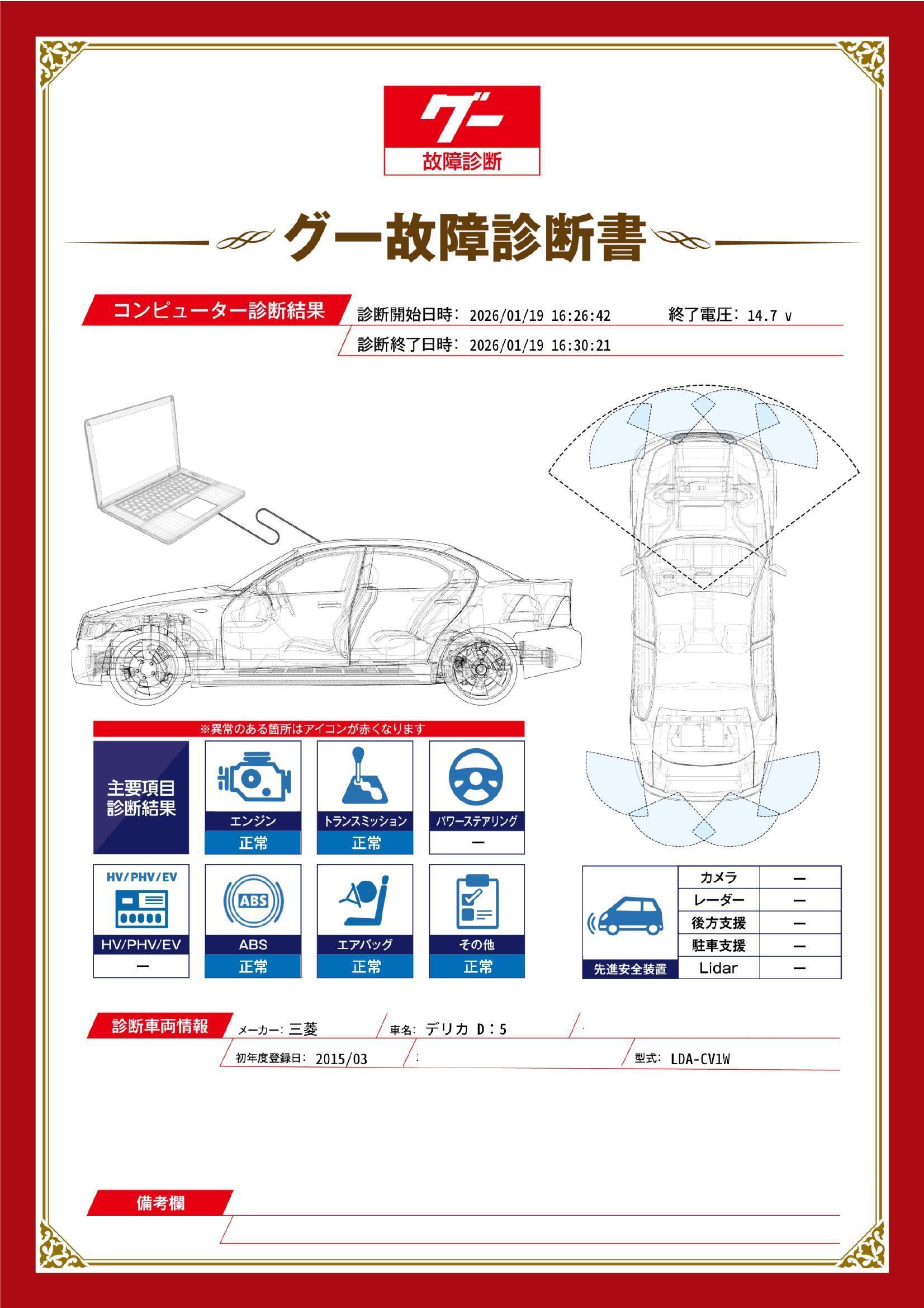 | 保証項目 | 3ヶ月・3000km以内ならエンジン、トランスミッション、ハイブリッド、ステアリング、ブレーキの各機構における主要項目を無償修理(または交換)いたします。 |