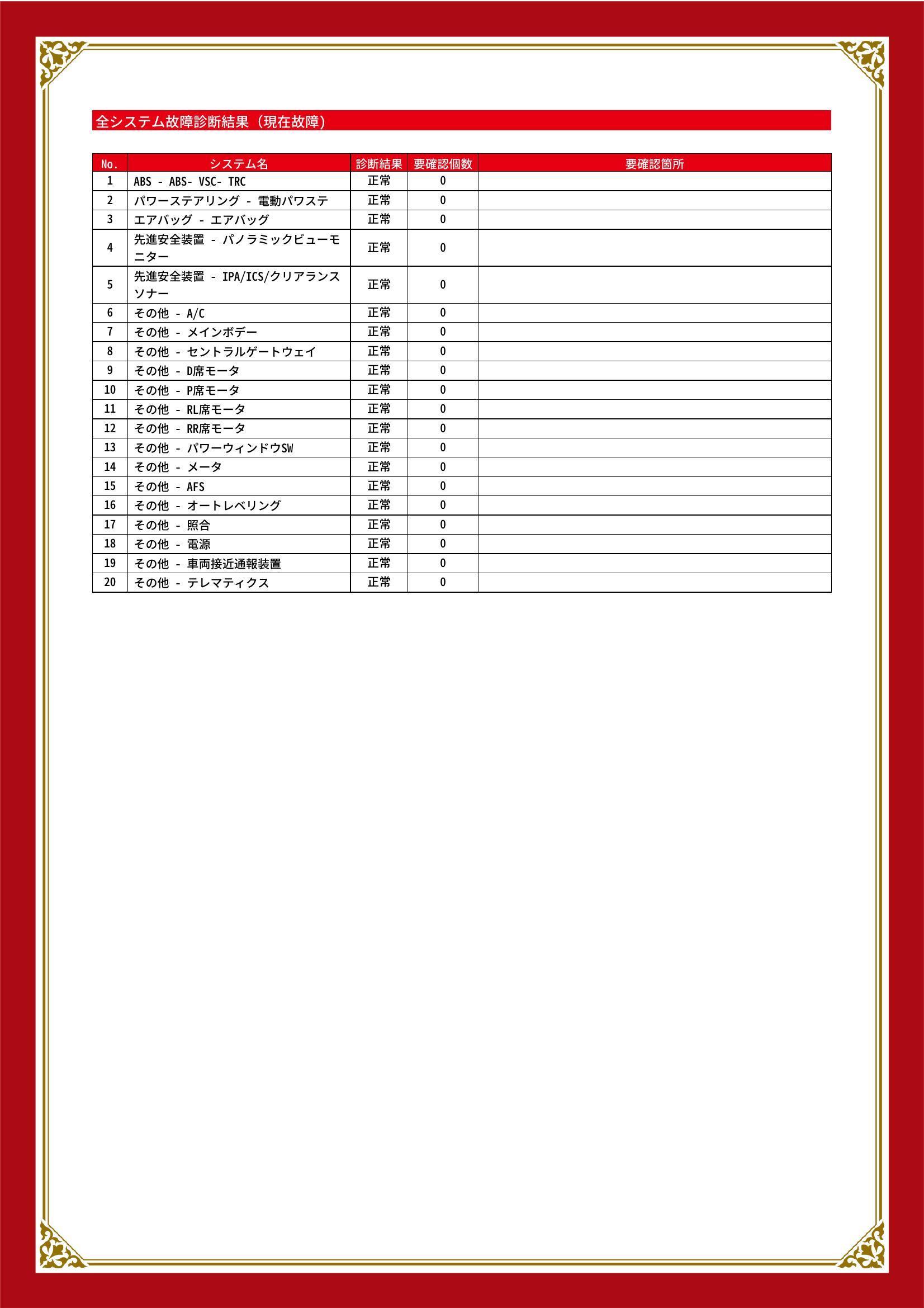 | 保証項目 | 3ヶ月・3000km以内ならエンジン、トランスミッション、ハイブリッド、ステアリング、ブレーキの各機構における主要項目を無償修理(または交換)いたします。 |