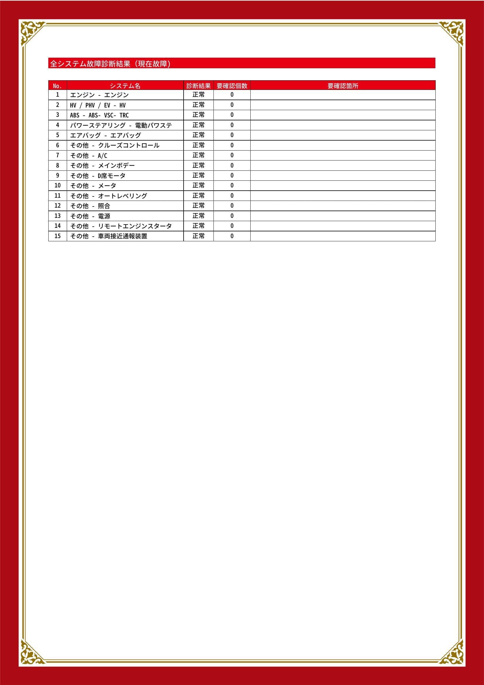 | 保証項目 | 3ヶ月・3000km以内ならエンジン、トランスミッション、ハイブリッド、ステアリング、ブレーキの各機構における主要項目を無償修理(または交換)いたします。 |