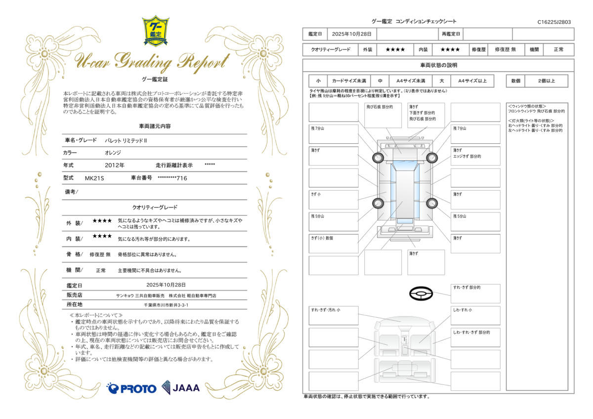 | 保証項目 | エンジン、ミッション本体のみ。修理金額の上限は車両本体価格までとなります。別途有料とはなりますが、期間の延長が可能です。基本部品はもちろんエアコン、オーディオ、ナビ、ドアミラーなど300項目対応可。 |