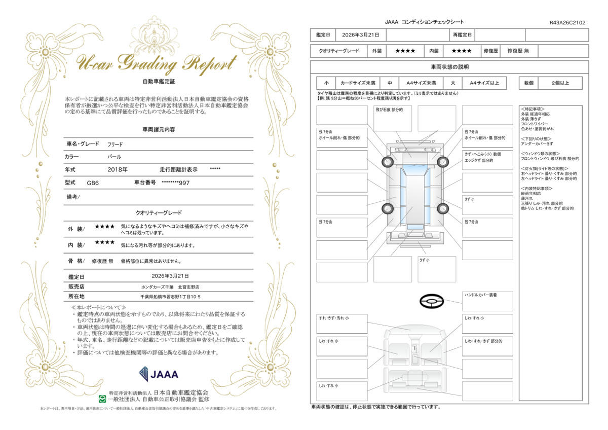 | 保証修理受付先 | 日本国内のHondaCars店、U−Select店であればどこでも修理対応が可能です。別途ホンダトータルケア(無料)にご登録頂ければ購入店舗までの無料ロードサービスもございます。 |