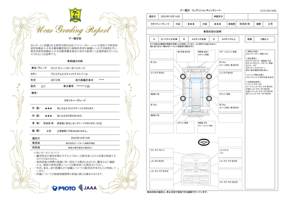 保証項目 | 警告チェックランプ点灯・スピードメーターが動かない・ハンドルがスムーズに操作できない・ギアが変速しない・ドアミラー・F・Rバンパーの破損・ガラスやヘッドライトのひび割れ エンジンや足廻りりから異音等。 |