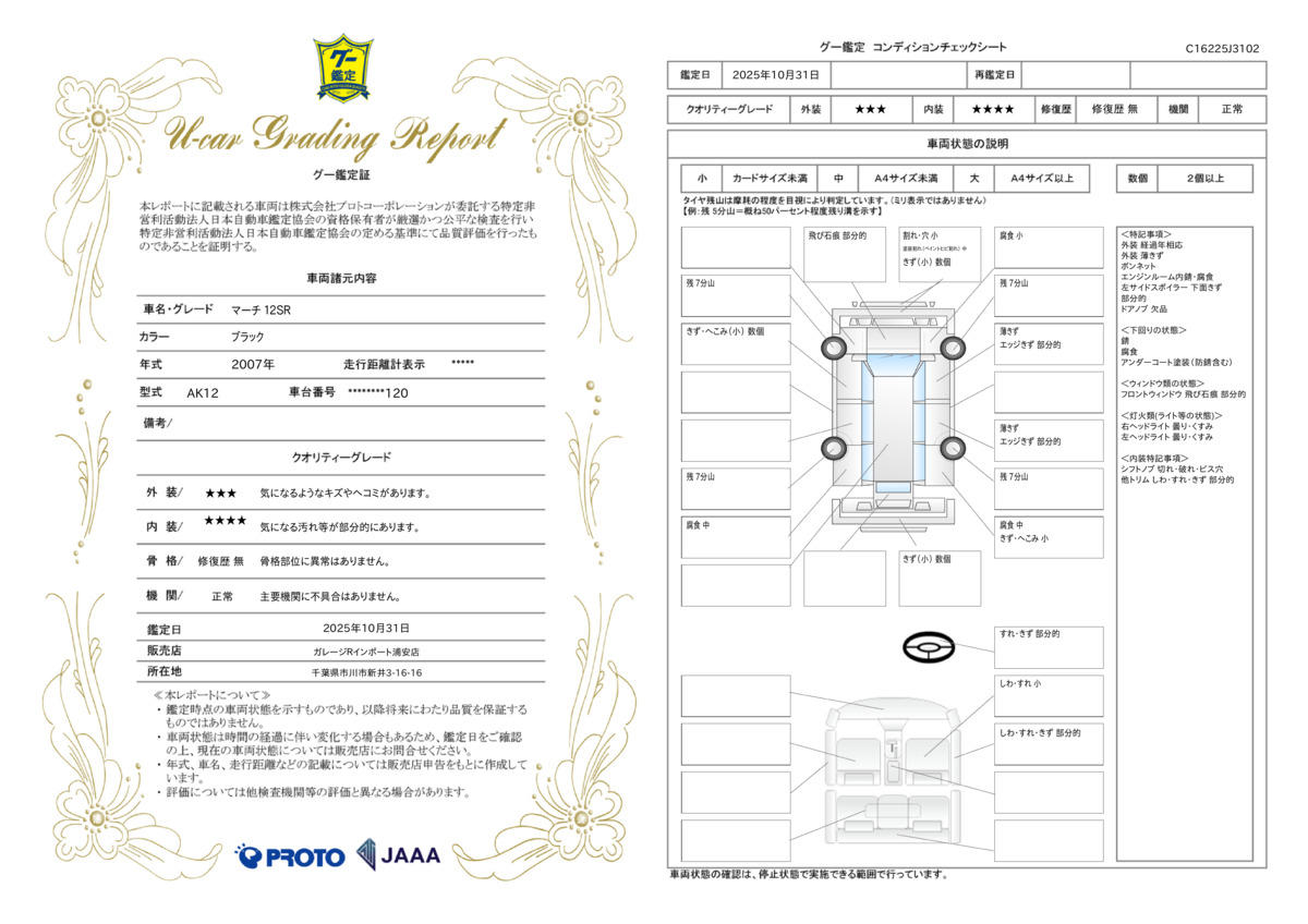 中古車の状態は、専門家でなければなかなか分かりにくいものです。外観は綺麗に見えても内装や隠れた部分、修復歴の有無などほとんど分かりません。お客様に安心してお車を選んで頂く為に、当社の展示車は全て第三者機関の日本自動車鑑定協会の鑑定師が中古車を鑑定。プロが一台一台チェックします。