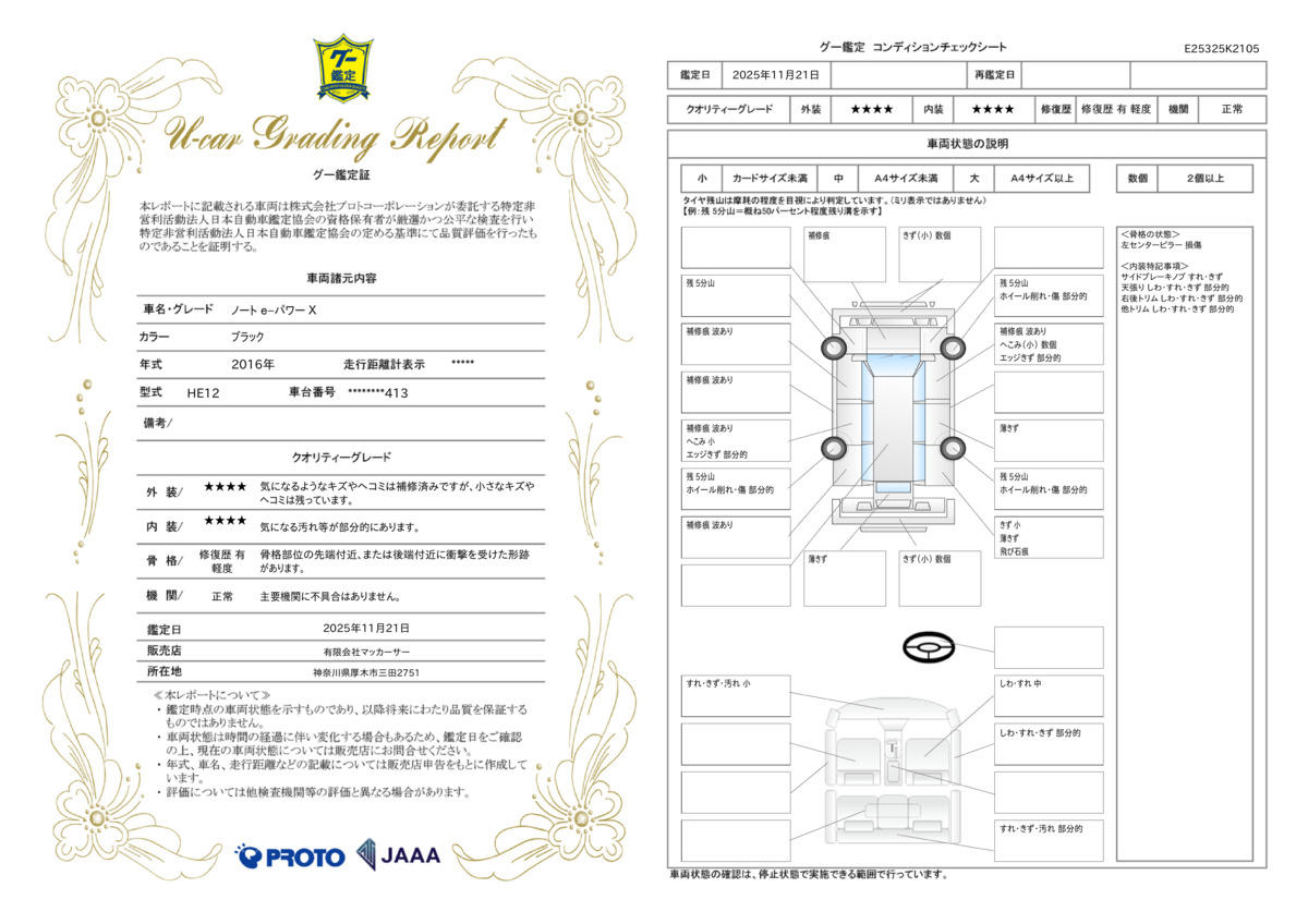 JAAA全車鑑定付です!!車両の状態、走行距離、事故等など、JAAA管理システムにより、一目でお客様に分かりやすい様に、鑑定書もお渡ししています。安心で低価格な車両を是非見つけて頂ければと思います。 5