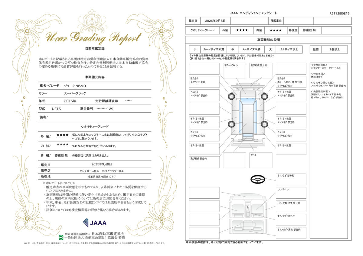当店の車両はすべて第三者機関の車両状態証明書を取得しています。また、初度登録より5年以内、走行距離5万キロ以内のお車で評価点★★★★以上のお車に限定しU−SelectPremiumをご用意しております。U−SelectPremiumの車両にはご納車より2年間走行距離無制限の保証付