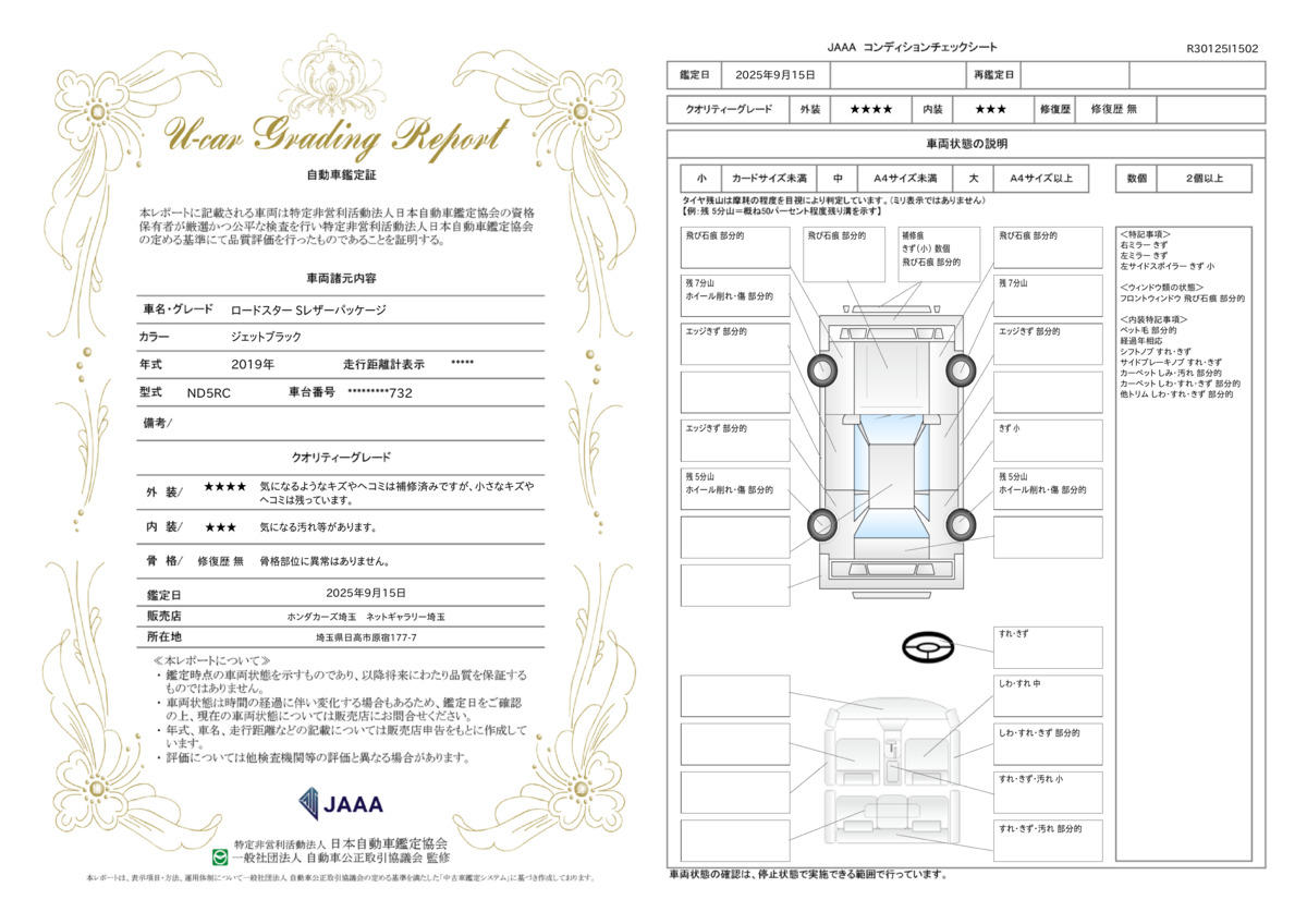 当店の車両はすべて第三者機関の車両状態証明書を取得しています。また、初度登録より5年以内、走行距離5万キロ以内のお車で評価点★★★★以上のお車に限定しU−SelectPremiumをご用意しております。U−SelectPremiumの車両にはご納車より2年間走行距離無制限の保証付