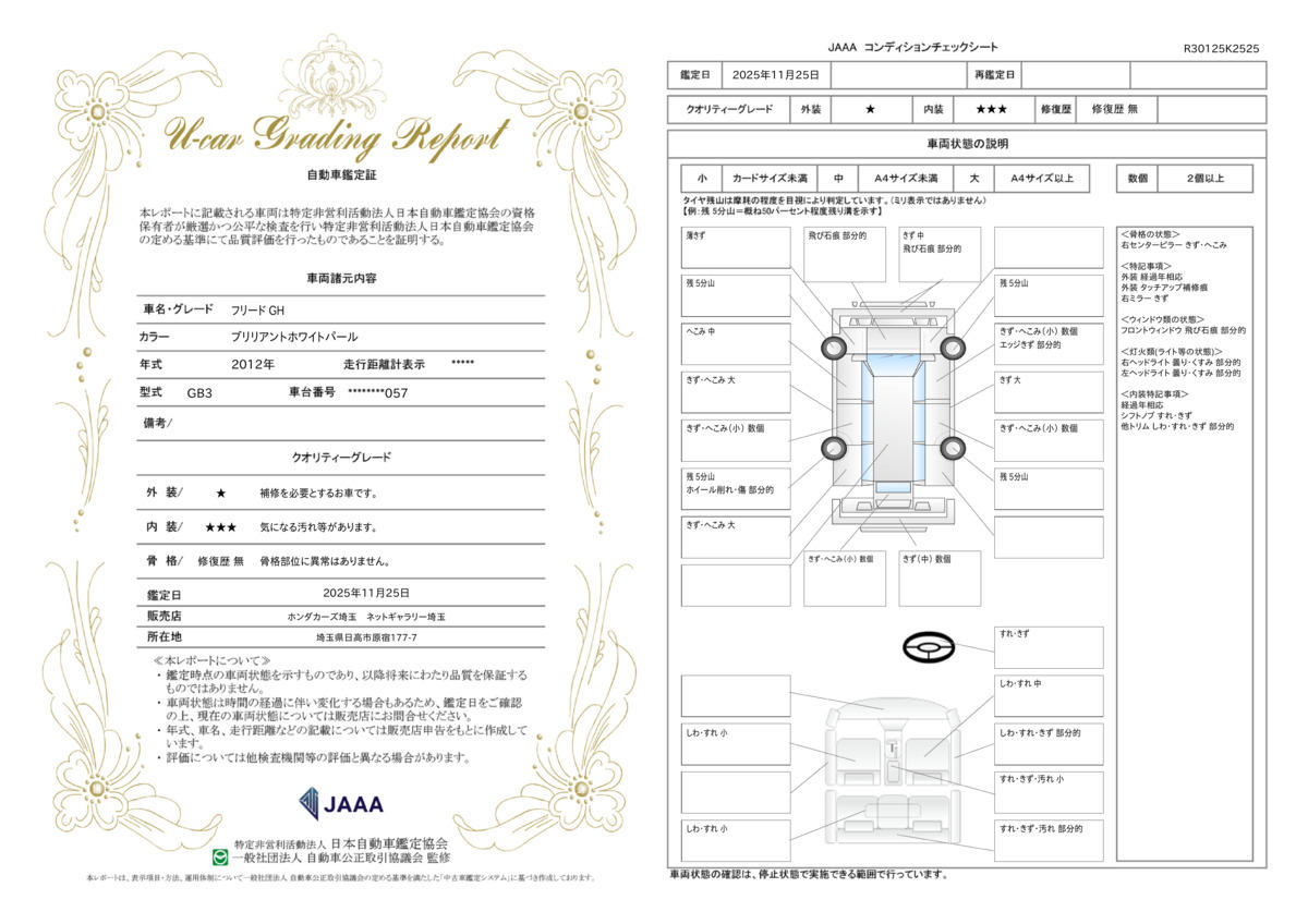 ホンダ フリード GH ●ワンオーナー●認定中古車●未加修現状販売「そのまんま車」傷や凹み 内装を現状展示●ワンセグTV●メモリーナビ●ETC●バックモニター●片側電動スライドドア●HIDライト●スマートキー●横滑り防止装置