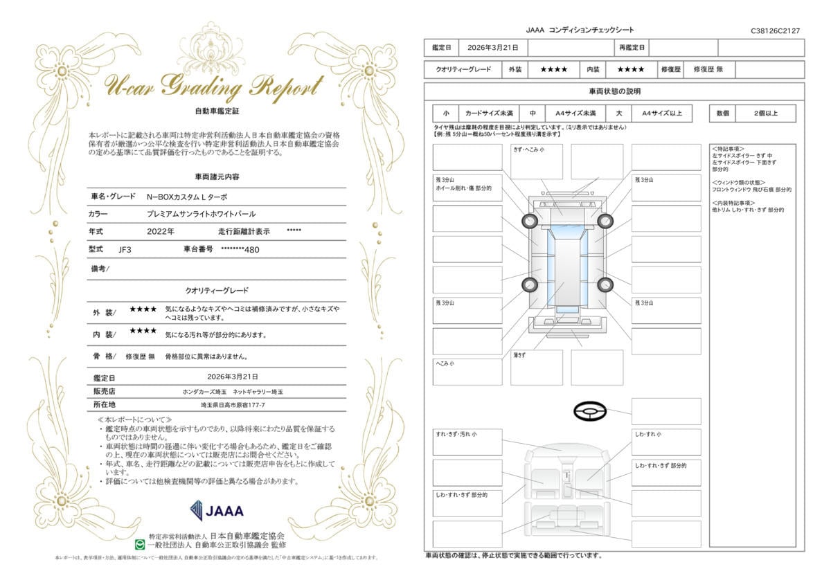 [保証付]:12ヶ月・走行無制限 ●納車から1年間の無料保証(ホッと保証)が付いています。万一の保証修理は、全国のホンダディーラーをご利用いただくことができます。お近くのお客様も遠方のお客様も安心してご購入いただくことができます。 |