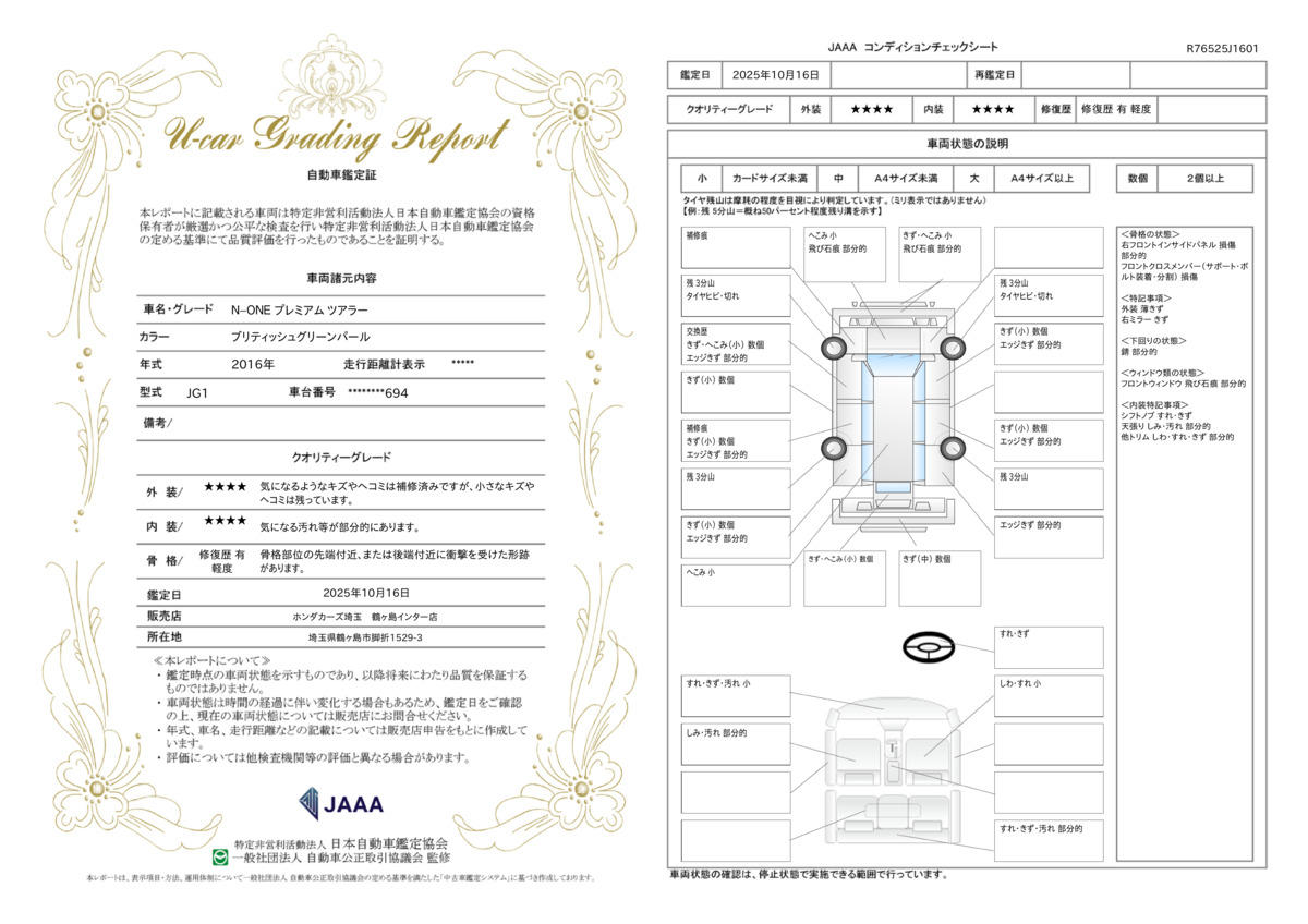 ホンダ N−ONE プレミアム ツアラー ブリティッシュグリーンパール 平成28年3月登録