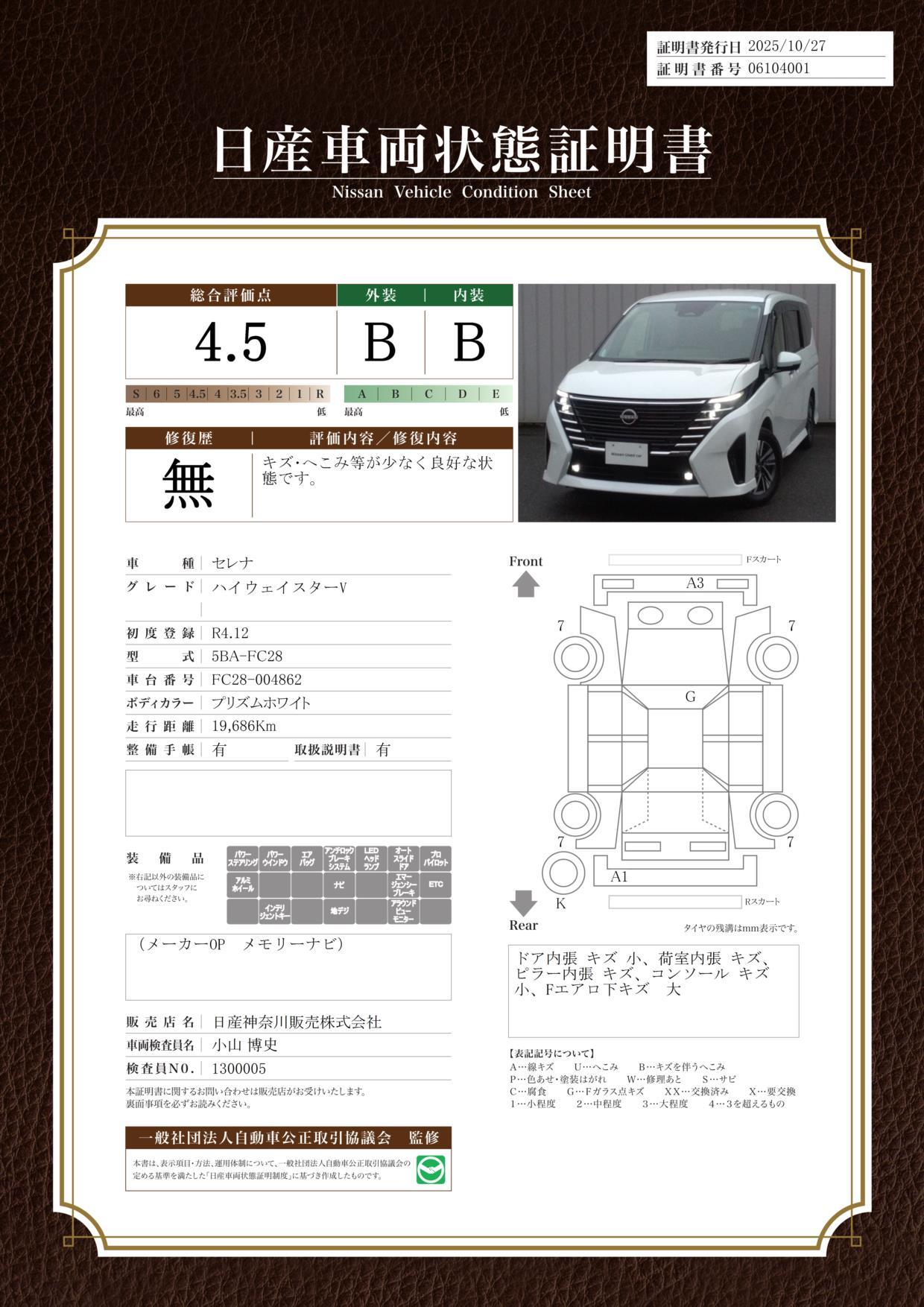 ご納車後 一ヶ月又は1000キロ目安の無料点検がございます。日産プリンス神奈川の61店舗はもちろん、日産整備工場で保証整備が受けられ安心です!納車の際にご予約を承ります、スタッフにご用命下さいませ。