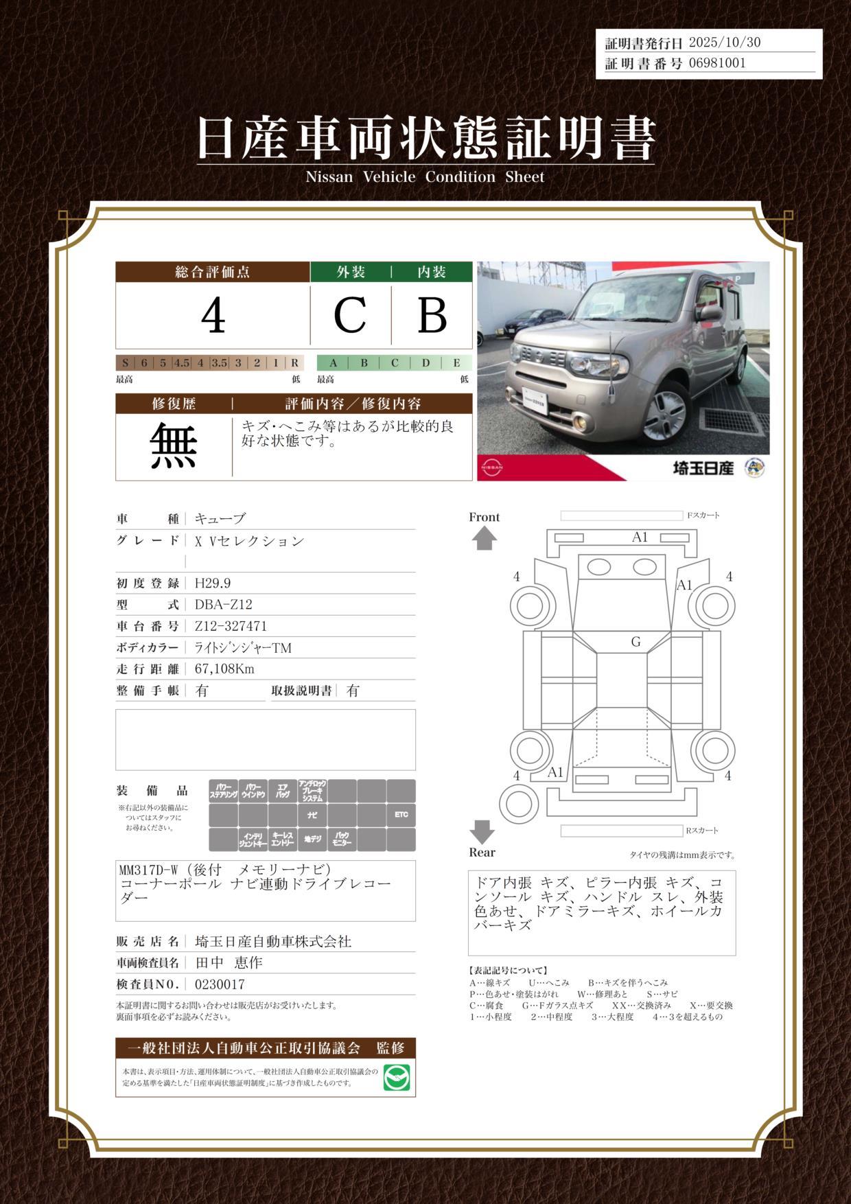 | 保証について | [保証付]:12ヶ月・走行無制限 12ヶ月・走行無制限で機関系・電装系など全国の日産ディーラーにてアフター可能で安心です!(消耗品・ディーラーOP・内外装部品除く)わずかなご負担で2年または3年まで延長出来ます。 |