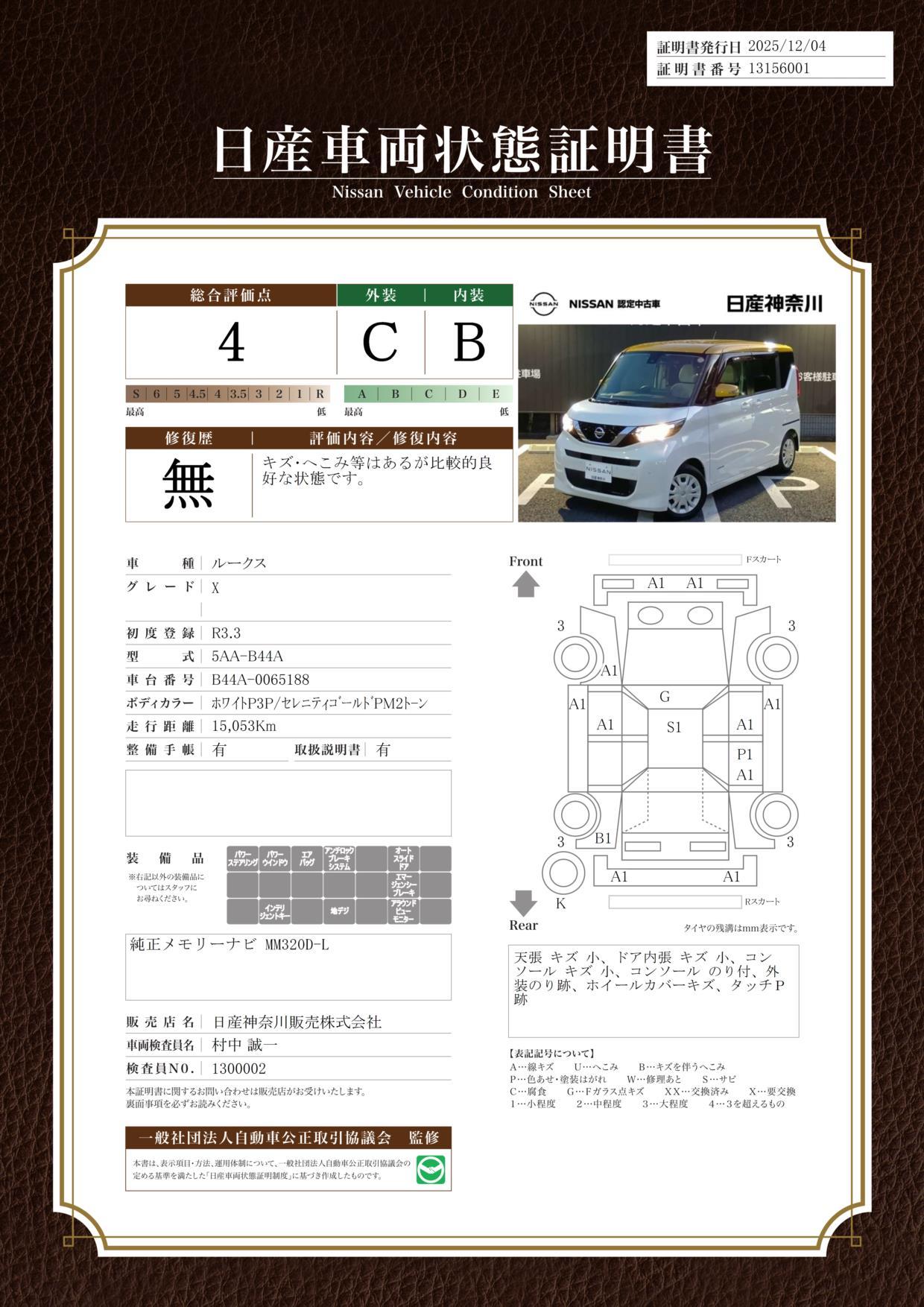 1オーナー弊社ユーザー様お下取車。令和7年7月31日(走行13,754キロ時)、6ヶ月点検。令和7年2月7日、日産神奈川麻生柿生店サービス工場にて法定12ヶ月整備実施(※整備記録簿御座います)。 2