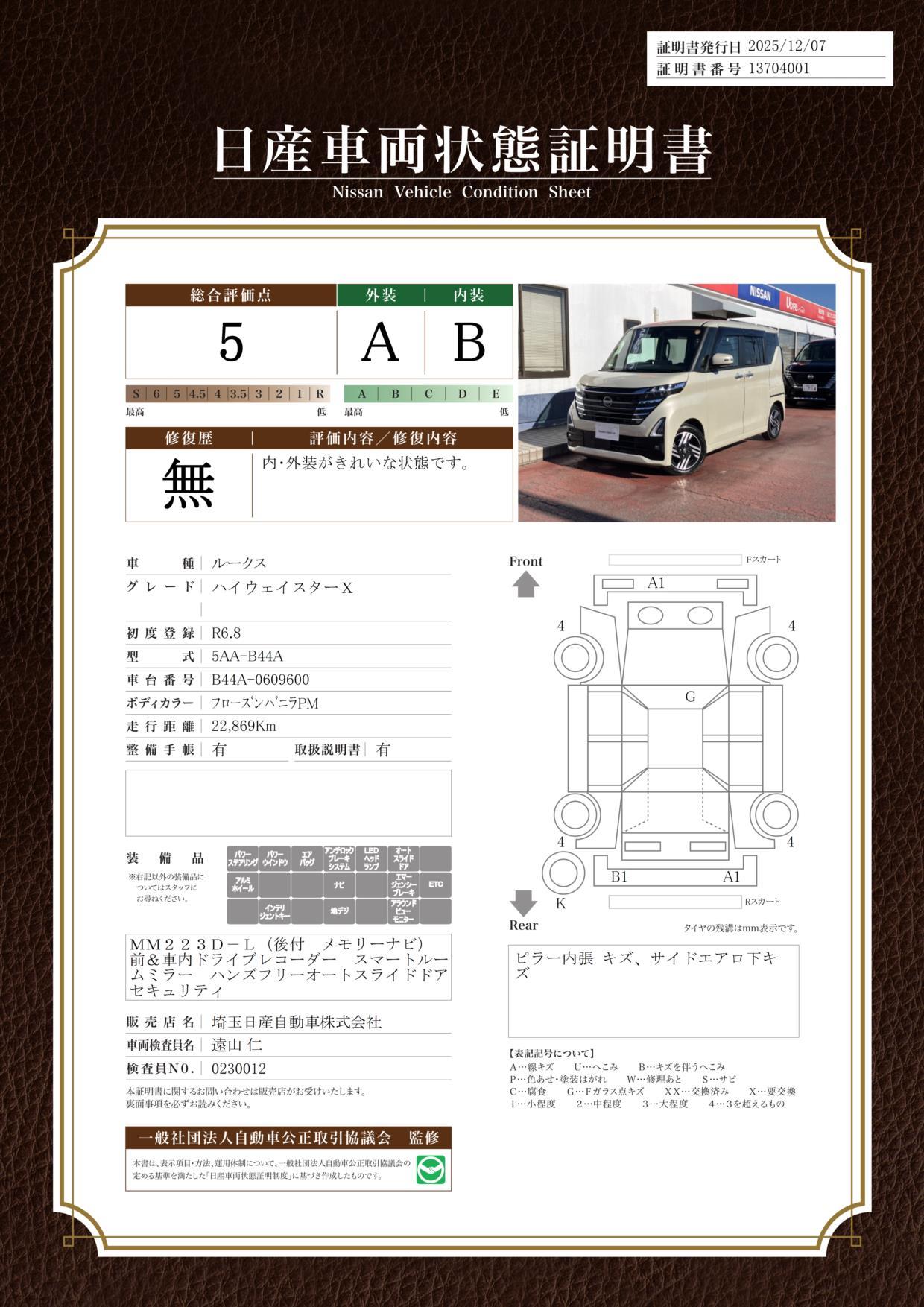 [保証付]:24ヶ月・走行無制限 全国統一保証になっていますので、お近くの日産ディーラーにて、2年間、走行距離無制限にて保証整備が受けられますので、ご安心ください。 |