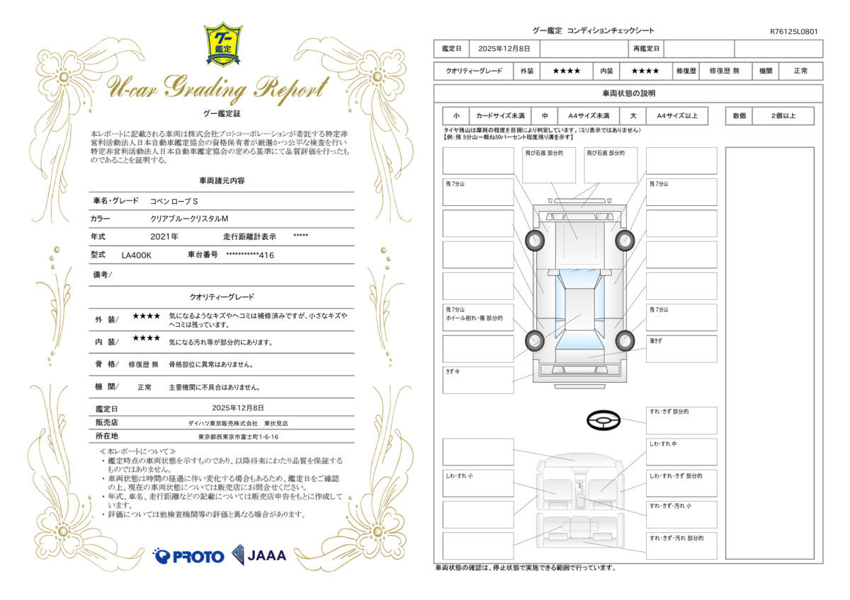 | 保証項目 | 保証対象部品は納車時に装備装着されていた純正部品です。社外部品、ボディ内外装部品、ゴム類部品、消耗部品および油脂類を除きます。 |