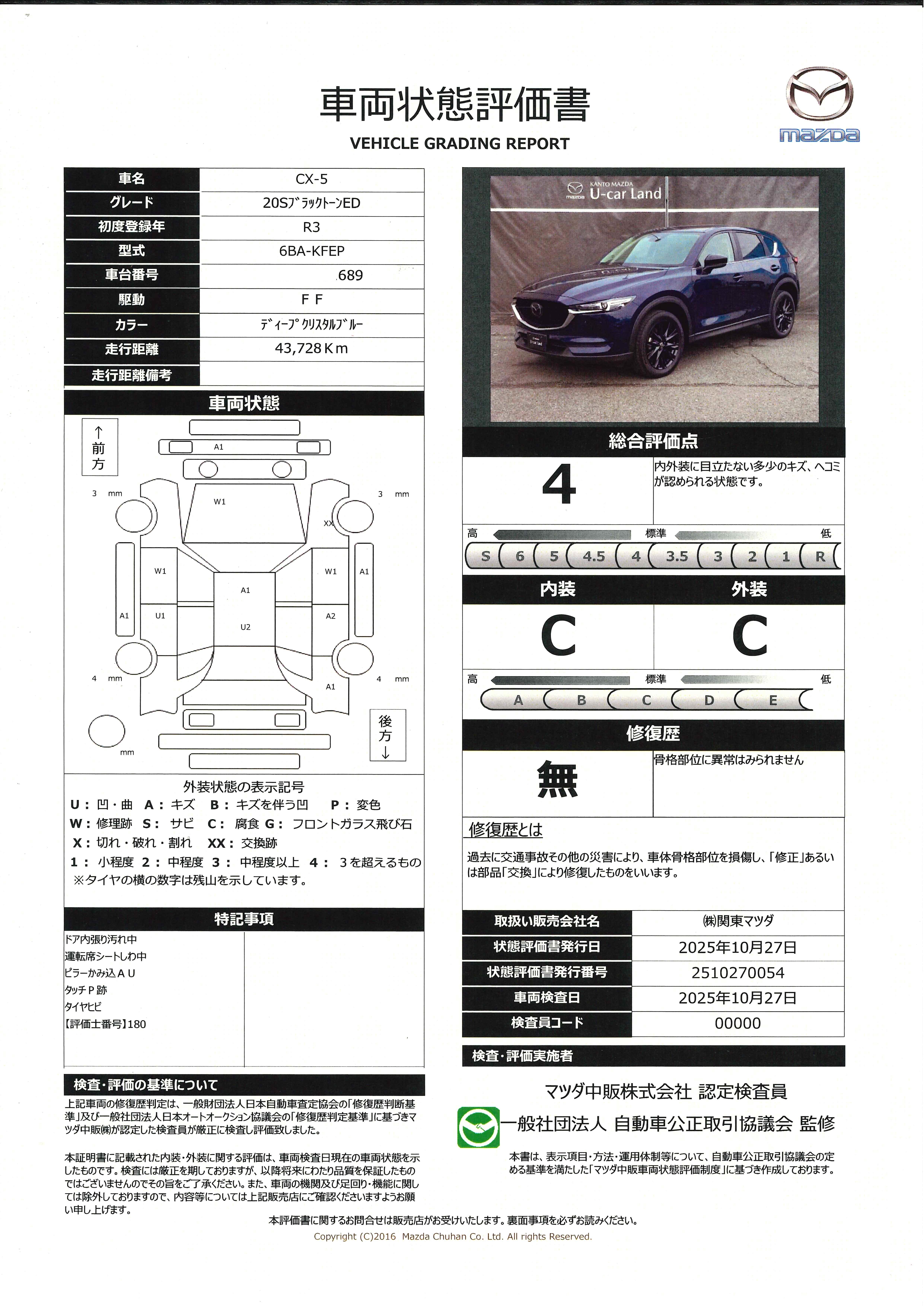 ・12ヶ月点検、又は、車検整備に相当する商品化整備を実施・納車後、1ヶ月後に無料点検整備を実施・全国のマツダディーラー共通のメンテナンスノートを発行・全国のマツダサービス網による万全のサポート体制※保証対象車両や保証内容など詳細はスタッフにお問い合わせください。