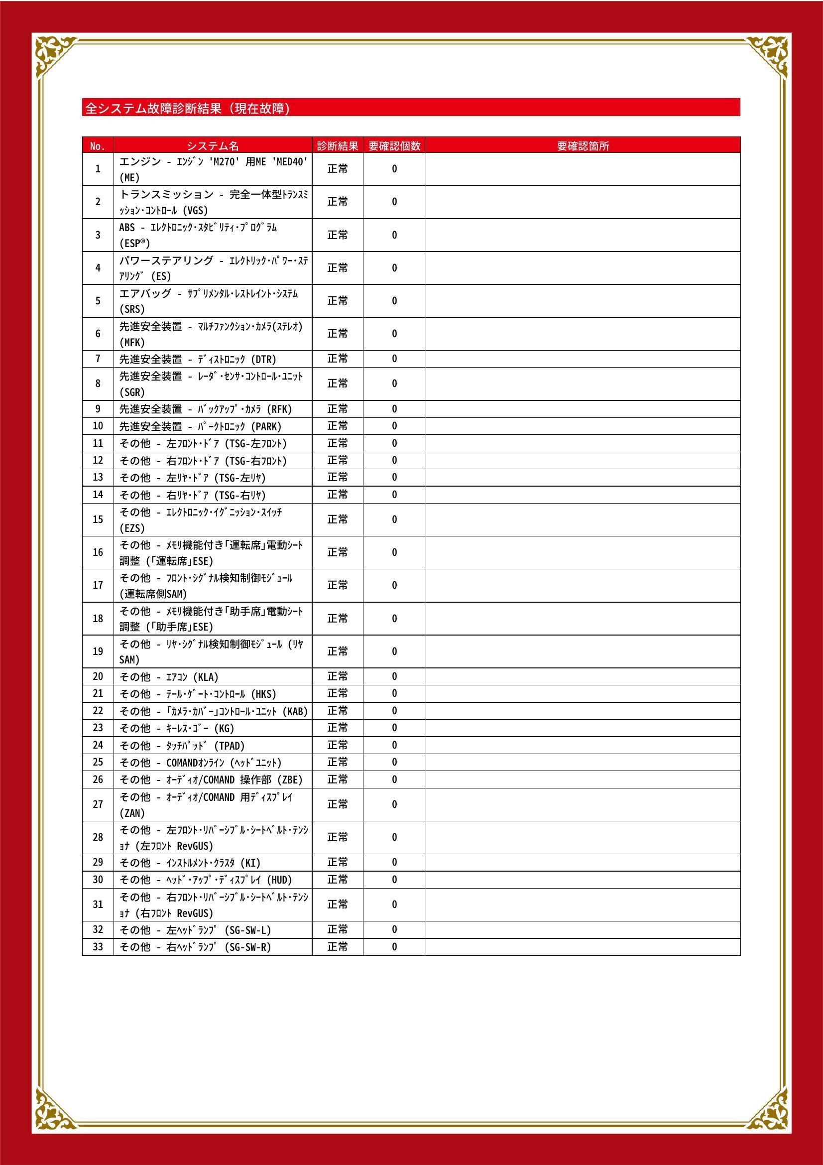 | 保証項目 | 1ヶ月以内なら走行距離無制限にてエンジン、トランスミッション、ハイブリッド、ステアリング、ブレーキの各機構における主要項目を無償修理(または交換)いたします。 |