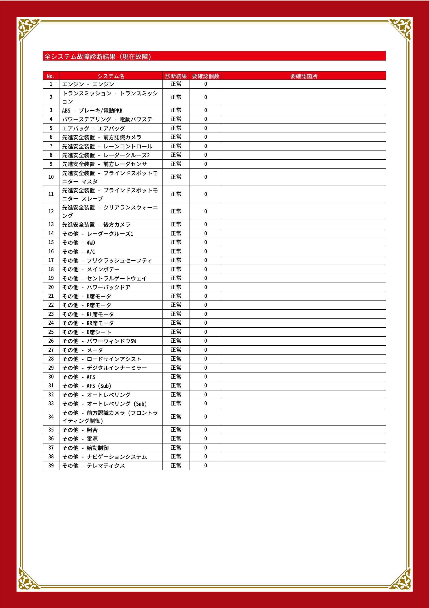 | 保証項目 | 3ヶ月・3000km以内ならエンジン、トランスミッション、ハイブリッド、ステアリング、ブレーキの各機構における主要項目を無償修理(または交換)いたします。 |