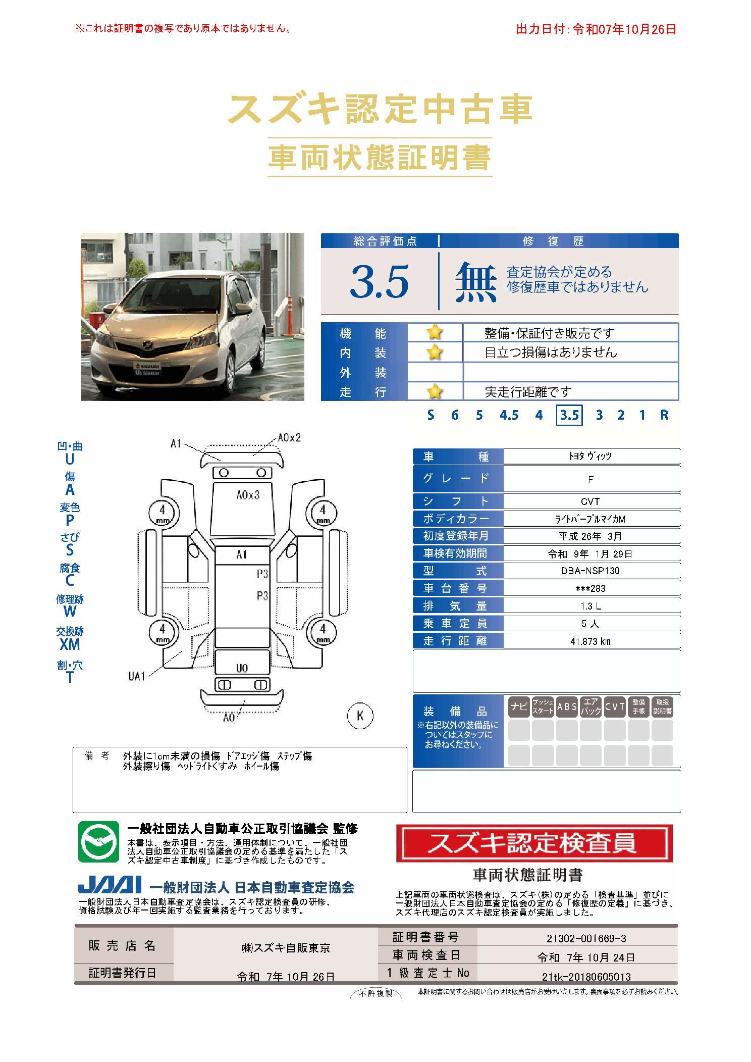 | 保証について | [保証付]:3ヶ月・3000km ※いずれか早い時期が保証適用の条件となります。 |