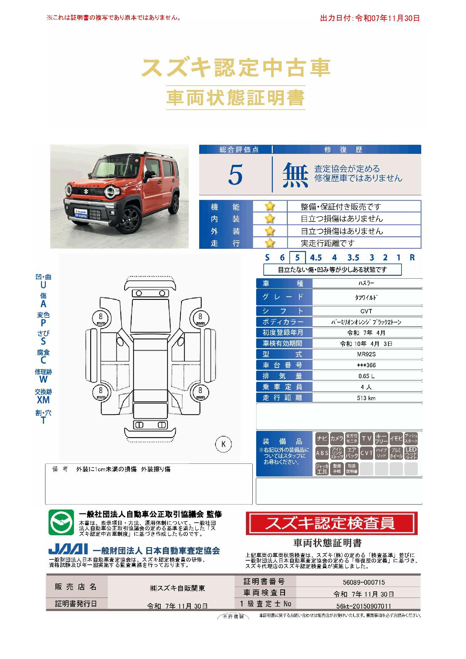 整備付 ★スズキディーラーによる安心の点検整備★ご納車前に点検整備を実施いたします。なお費用は車両代に含まれておりますので別途費用はかかりません。 |