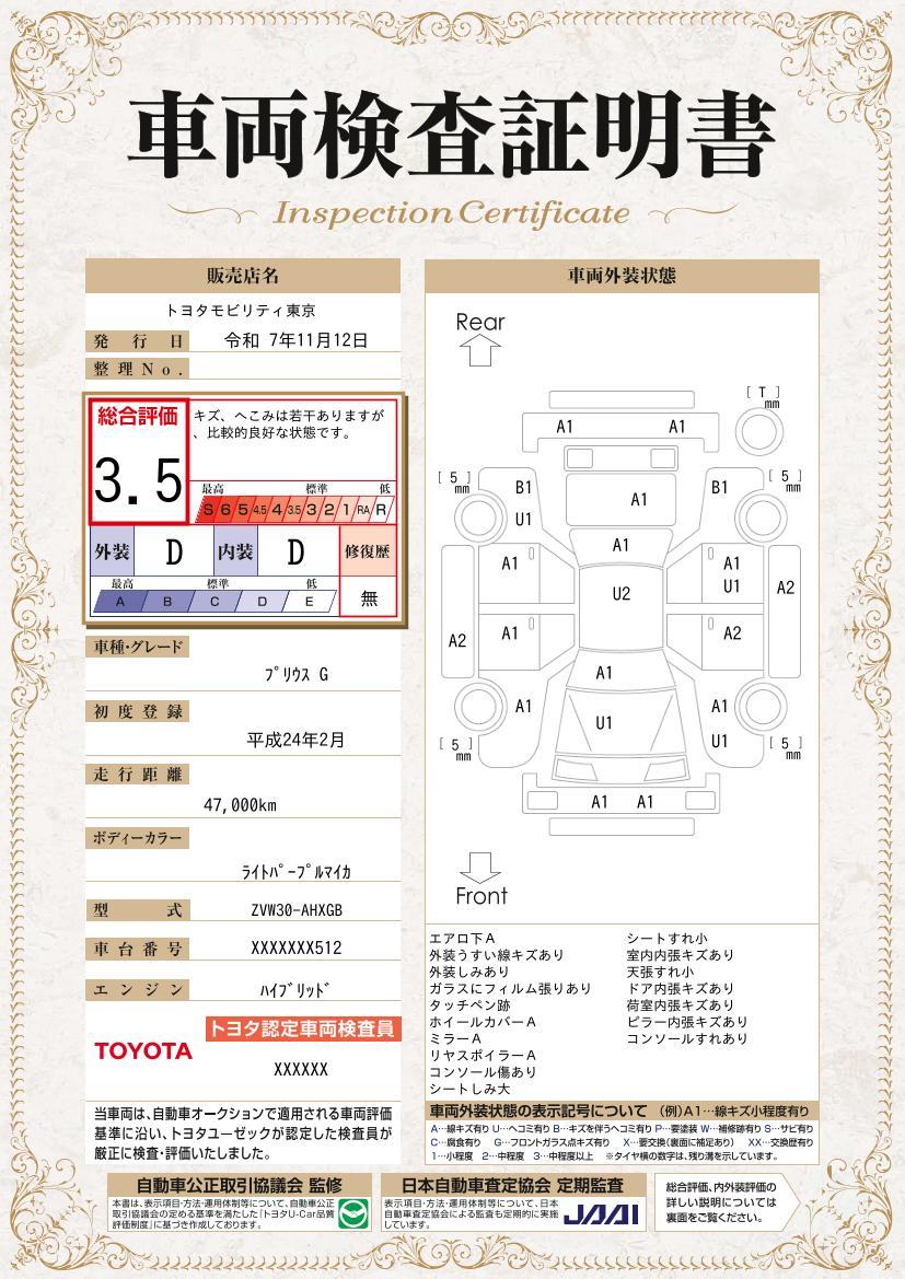 中古車は1台ずつコンディションが違います。トヨタでは中古車の総合評価や内外装の状態などをひと目で分かるよう、プロの検査員が実施した車両検査証明書をご用意しています。 39