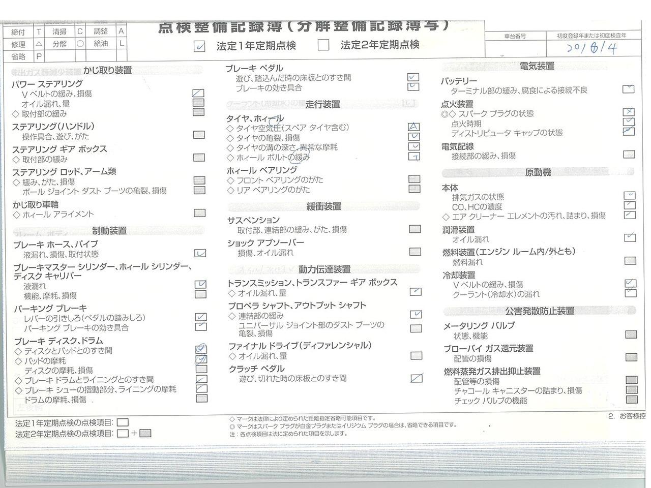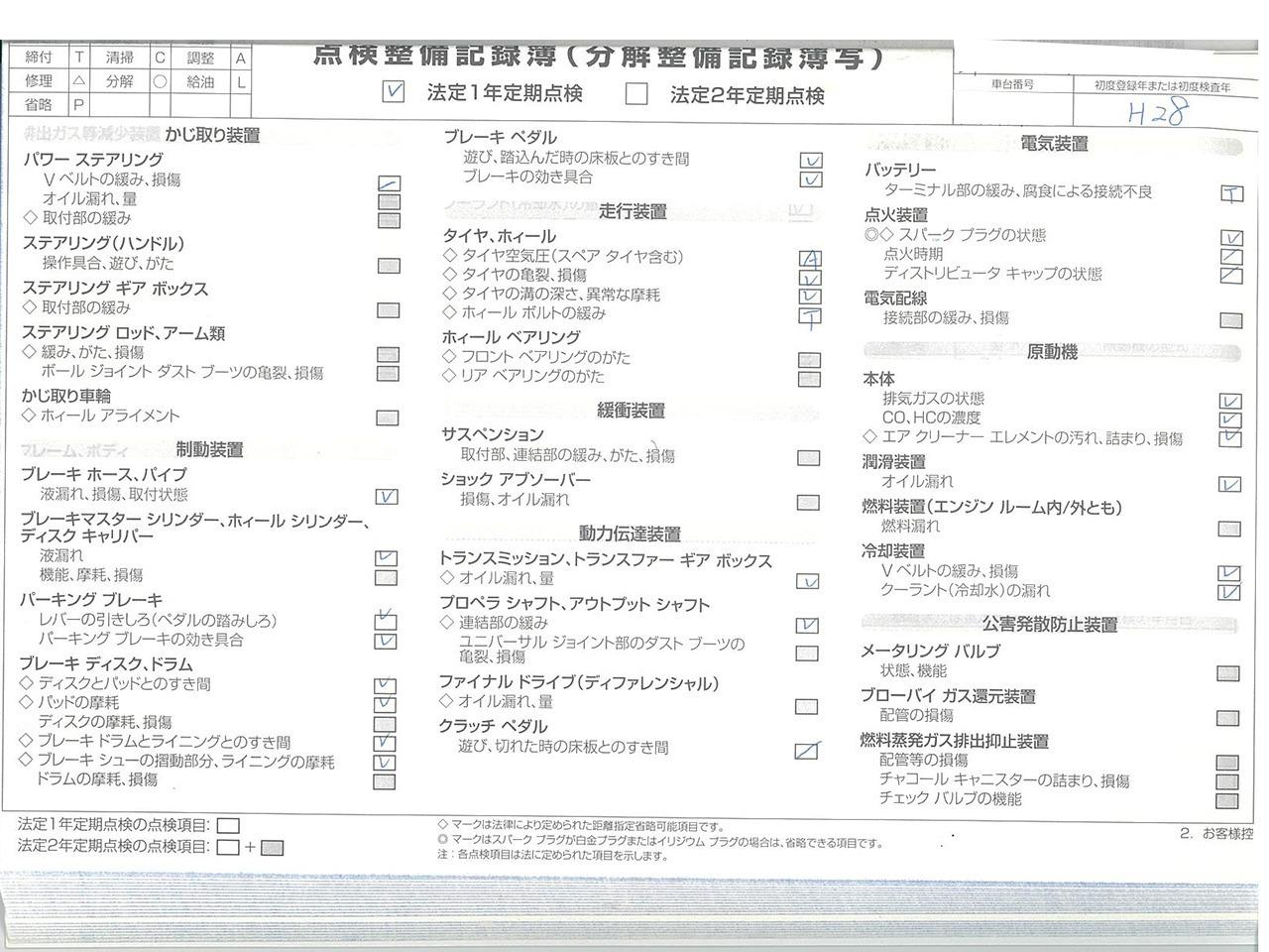 整備付 ご契約後からご納車までに認証工場にて法定点検を実施致します。点検費用は支払総額に含まれております。点検整備記録簿を発行致します。 |