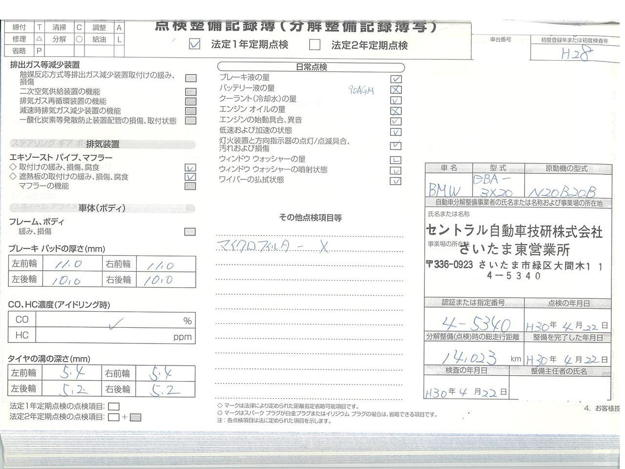 | 当社はBMWクオリティパートナー認定店です。ご納車前に認証工場にて点検致します。点検整備記録簿も発行致します。 |