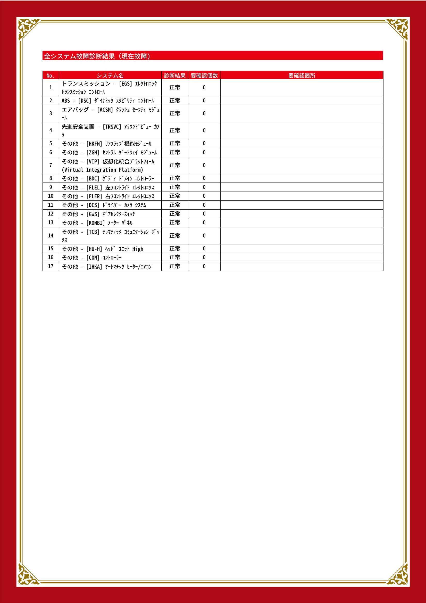 | 保証項目 | エンジン・トランスミッション・ステアリング・ブレーキ・ハイブリッドの各機構における主要項目を無償修理致します。消耗品や油脂類を含む部品代は保証対象外となります。 |