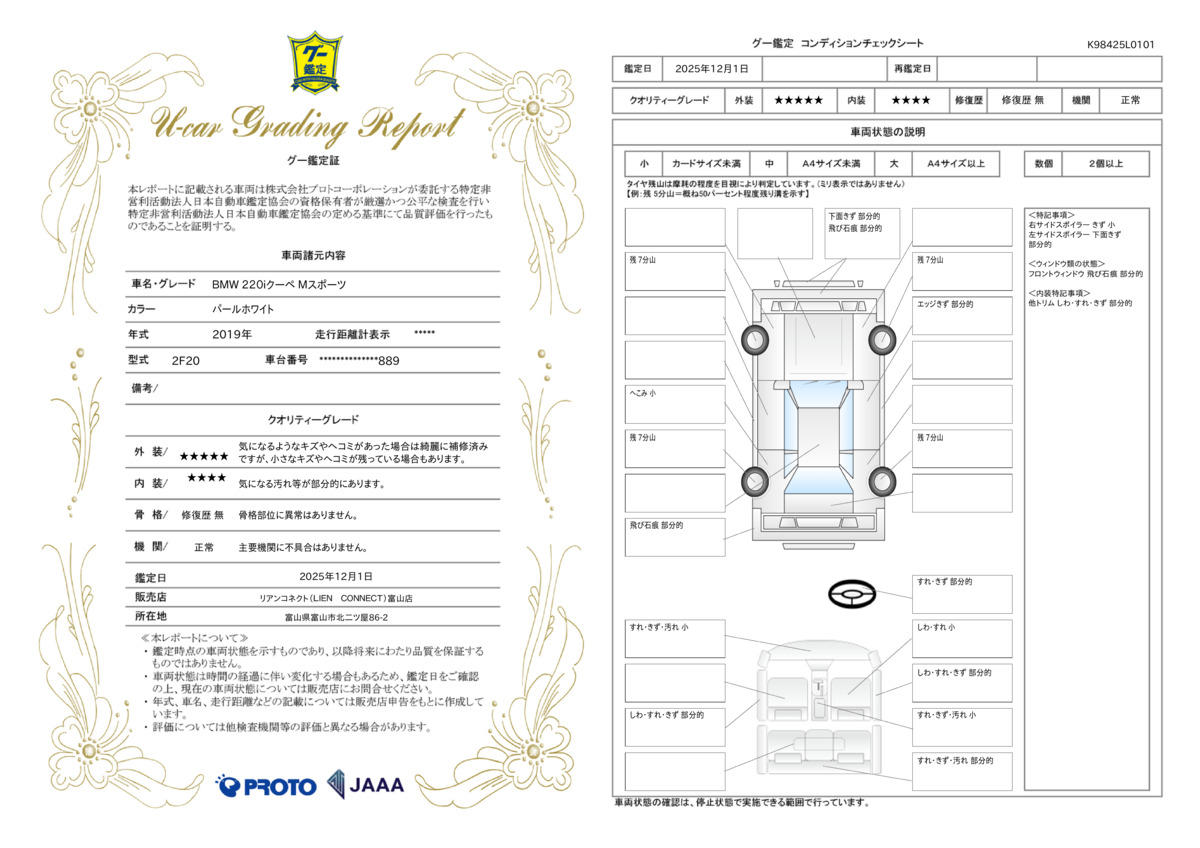 このお車は第三者機関(JAAA)が鑑定を行い、その結果を鑑定証として発行しております。