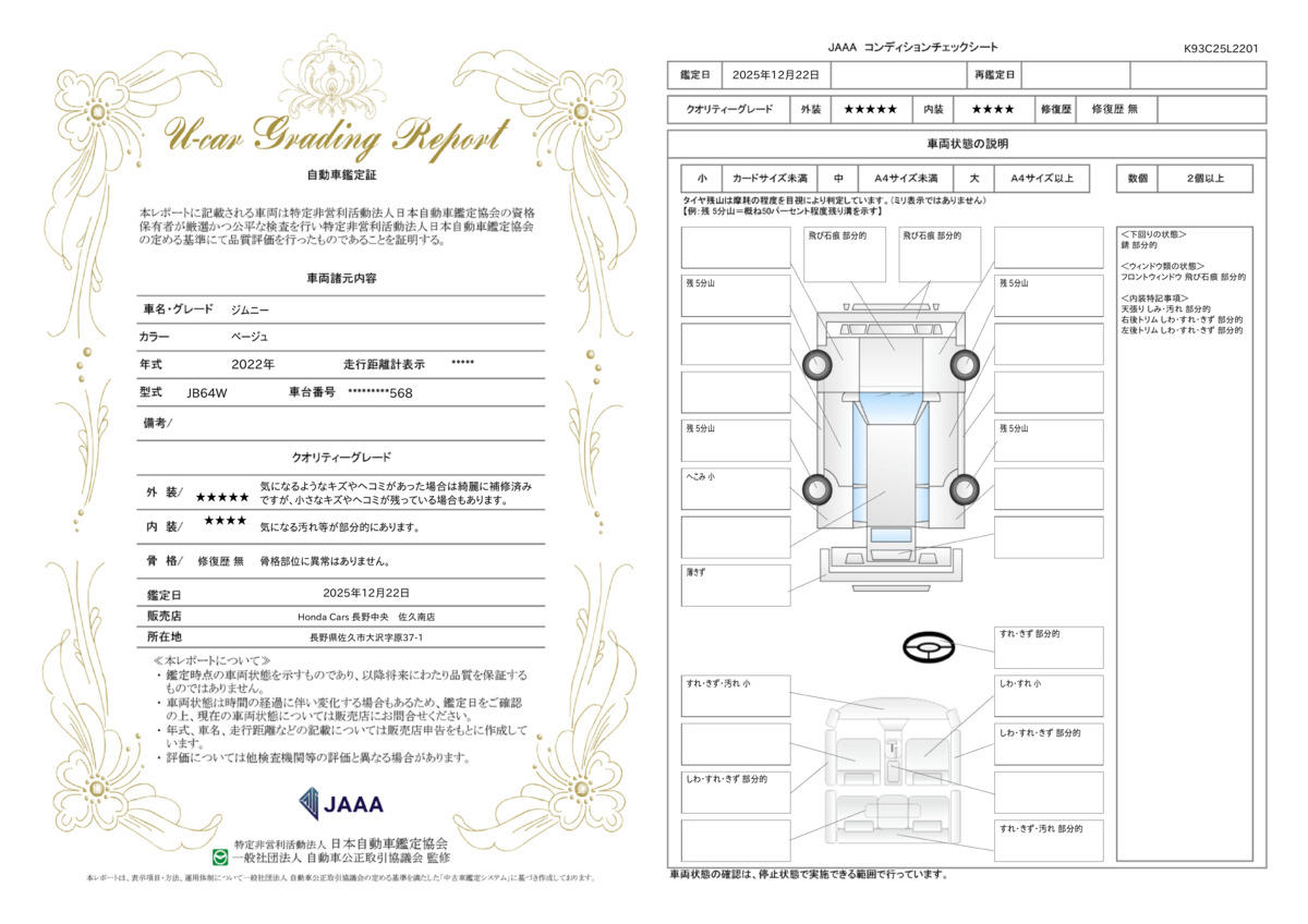 Honda車のプロによる点検に加え、クルマの内外装などについて信頼性の高い第三者機関が検査した結果※をお渡しいたします。※検査結果は、JAAI,AIS,JAAAの3社の中からいずれかになります。