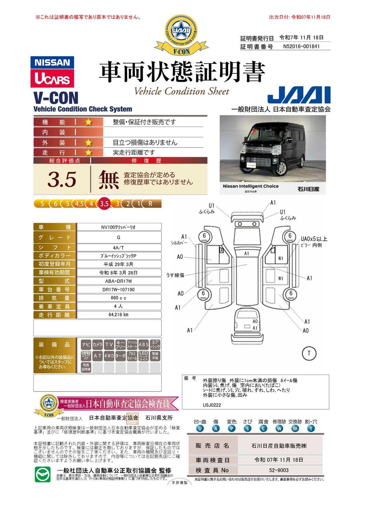 走行距離無制限、1年間の長期無料保証になります!全国の日産販売会社で保証修理を受けることができます!※消耗品や油脂類を除く全パーツに適応しておりますが、一部対象外の部品もございますので、詳しくはお尋ね下さい。※車両本体価格が30万以上のお車が対象となります。
