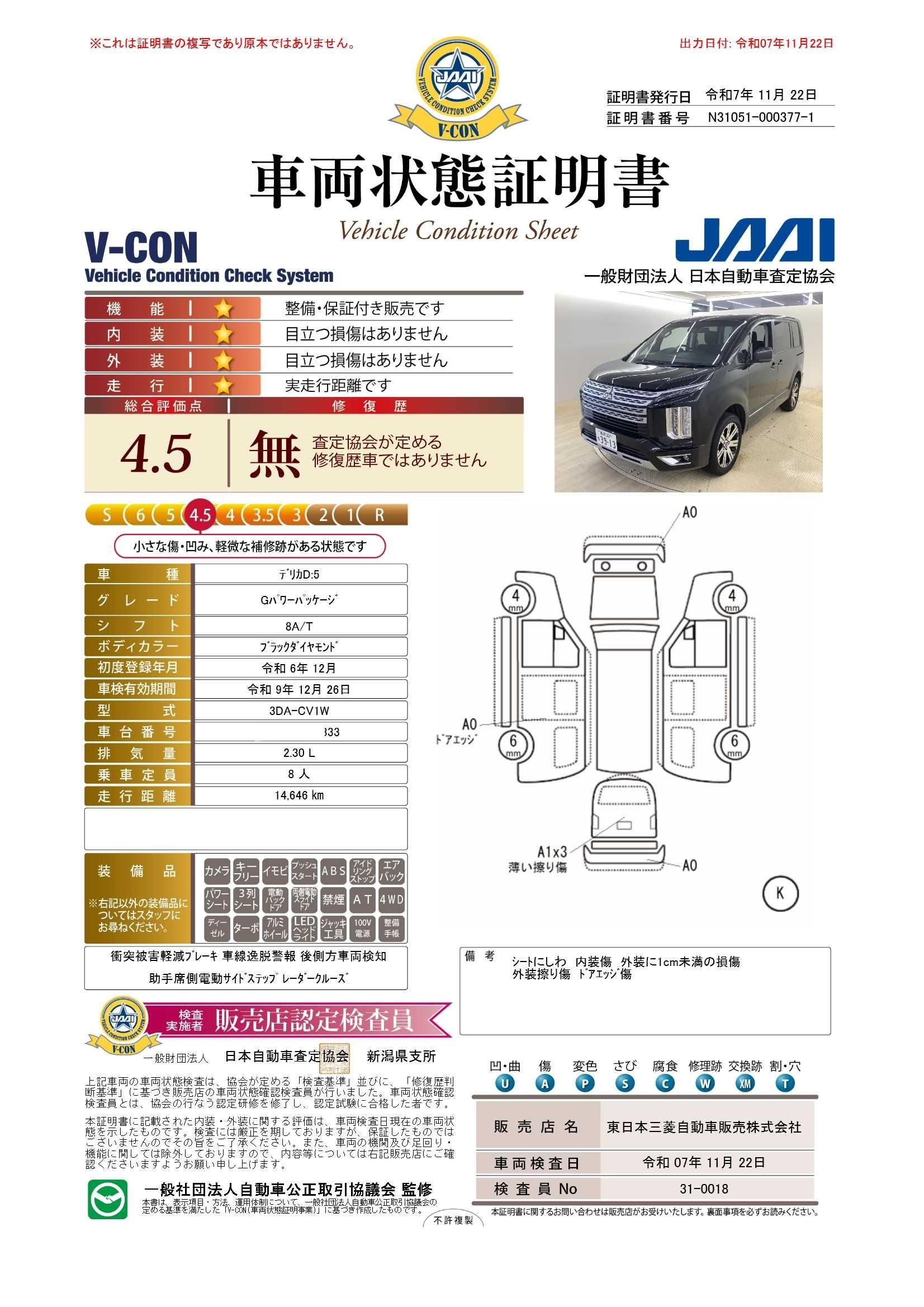 三菱認定UCARなら安心!ダイヤモンド保証プレミアムは3年間、ダイヤモンド保証は1年間、走行距離無制限で保証。延長保証もございます。詳しくは、スタッフまでお気軽にお問い合わせください。【最大100項目に及ぶ納車前点検】を実施し、安心できる車を納車致します。
