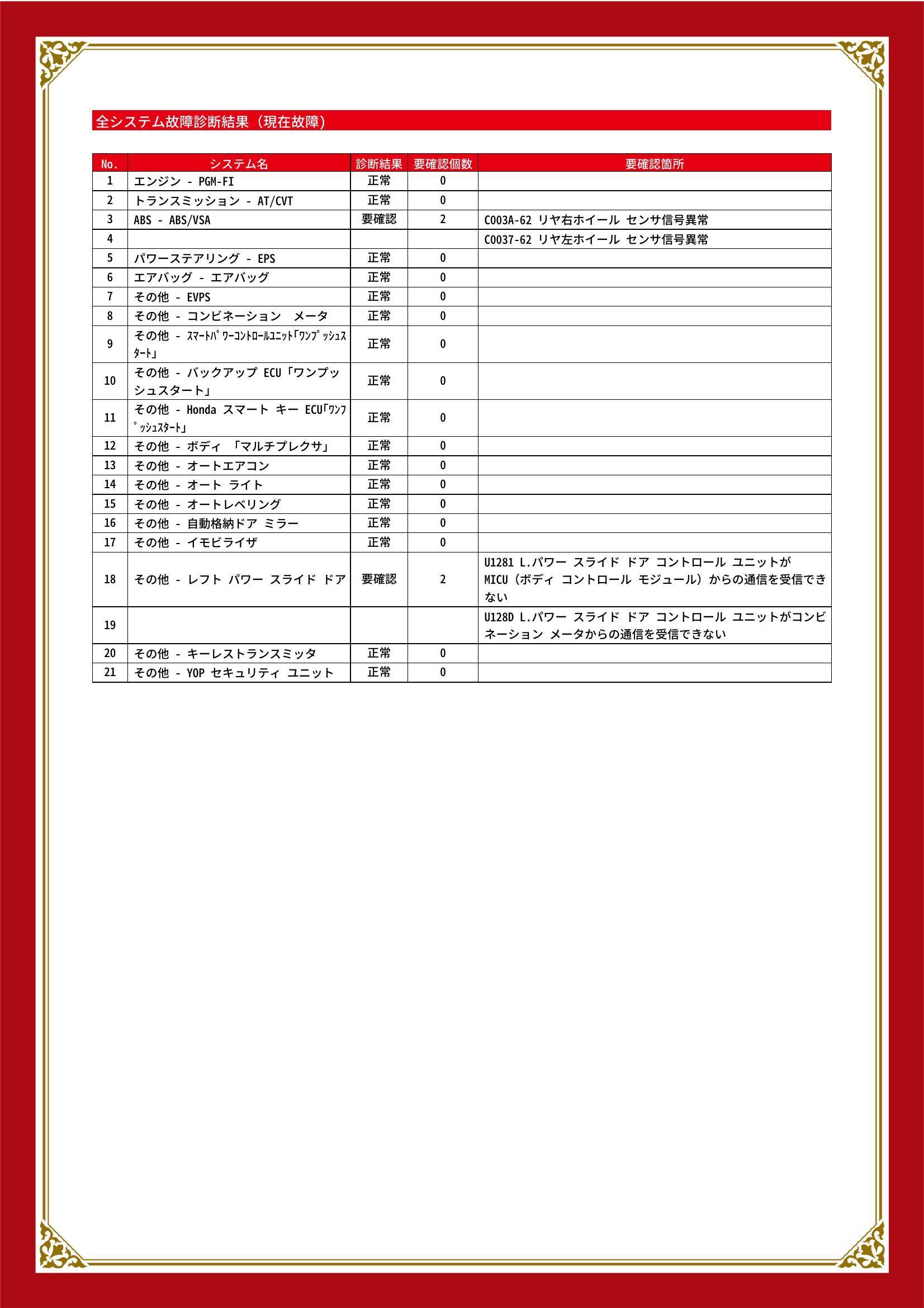 | 保証項目 | 3ヶ月・3000km以内ならエンジン、トランスミッション、ハイブリッド、ステアリング、ブレーキの各機構における主要項目を無償修理(または交換)いたします。 |