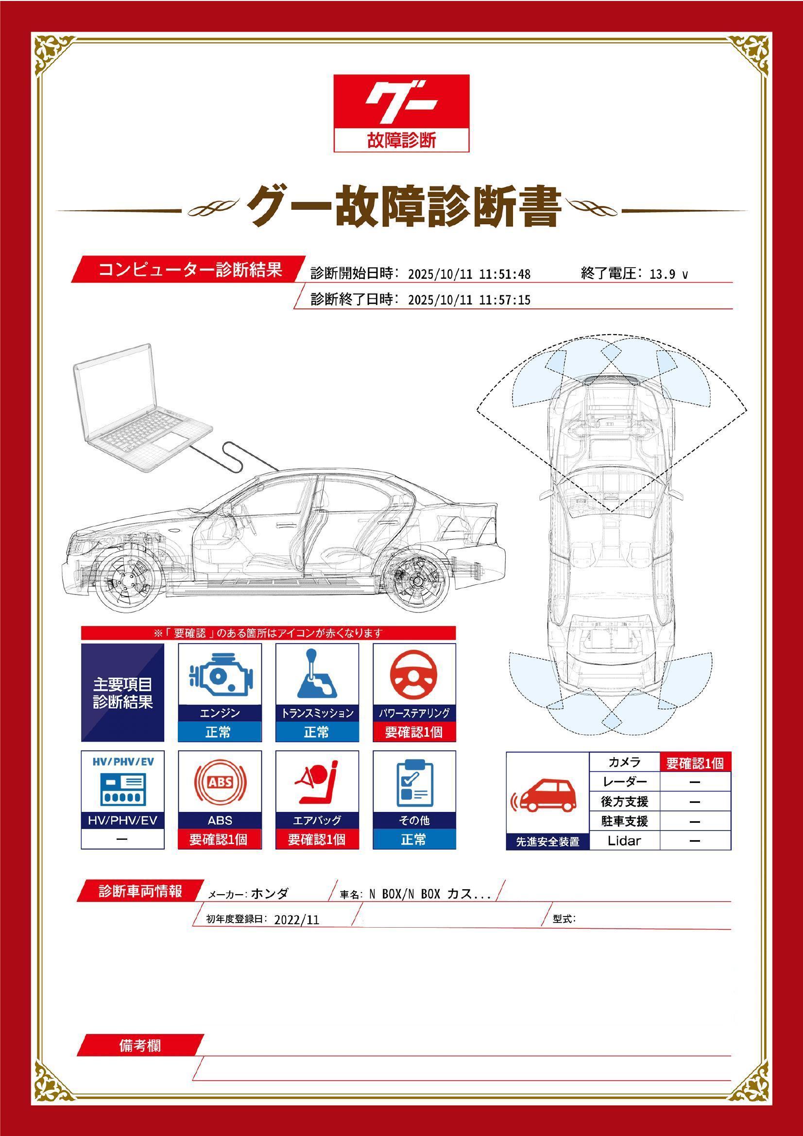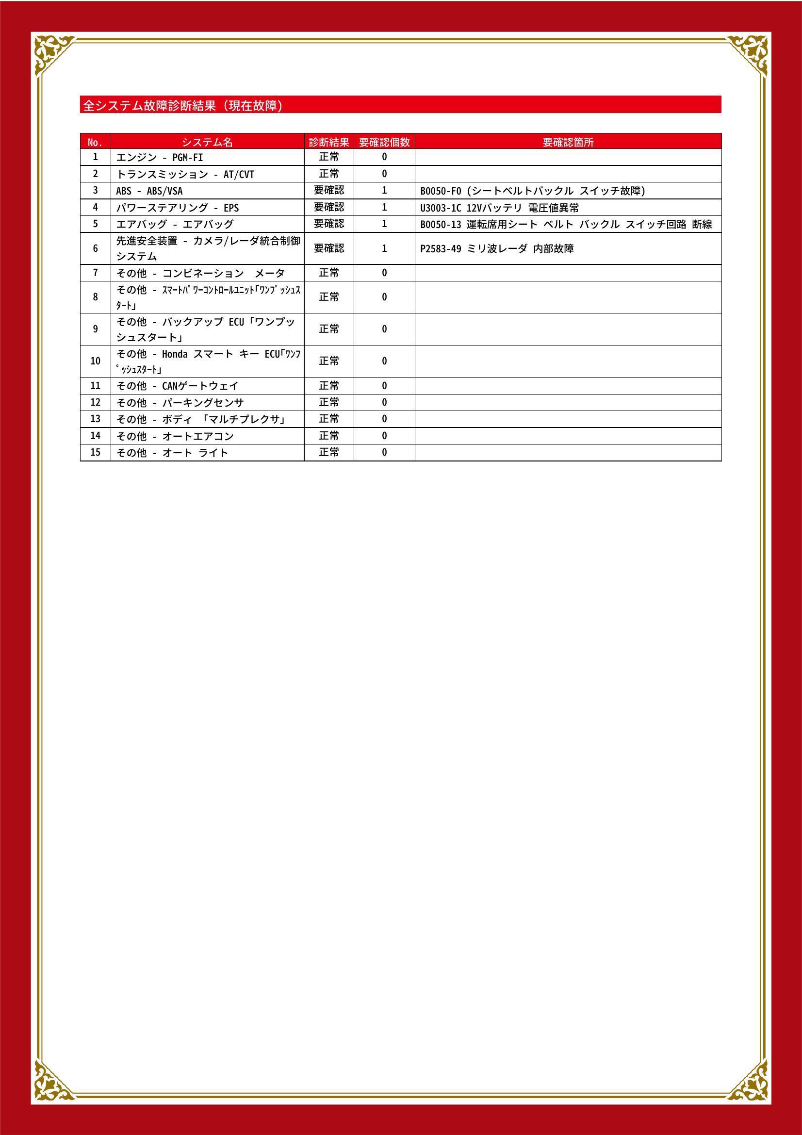 | 保証項目 | 3ヶ月・3000km以内ならエンジン、トランスミッション、ハイブリッド、ステアリング、ブレーキの各機構における主要項目を無償修理(または交換)いたします。 |