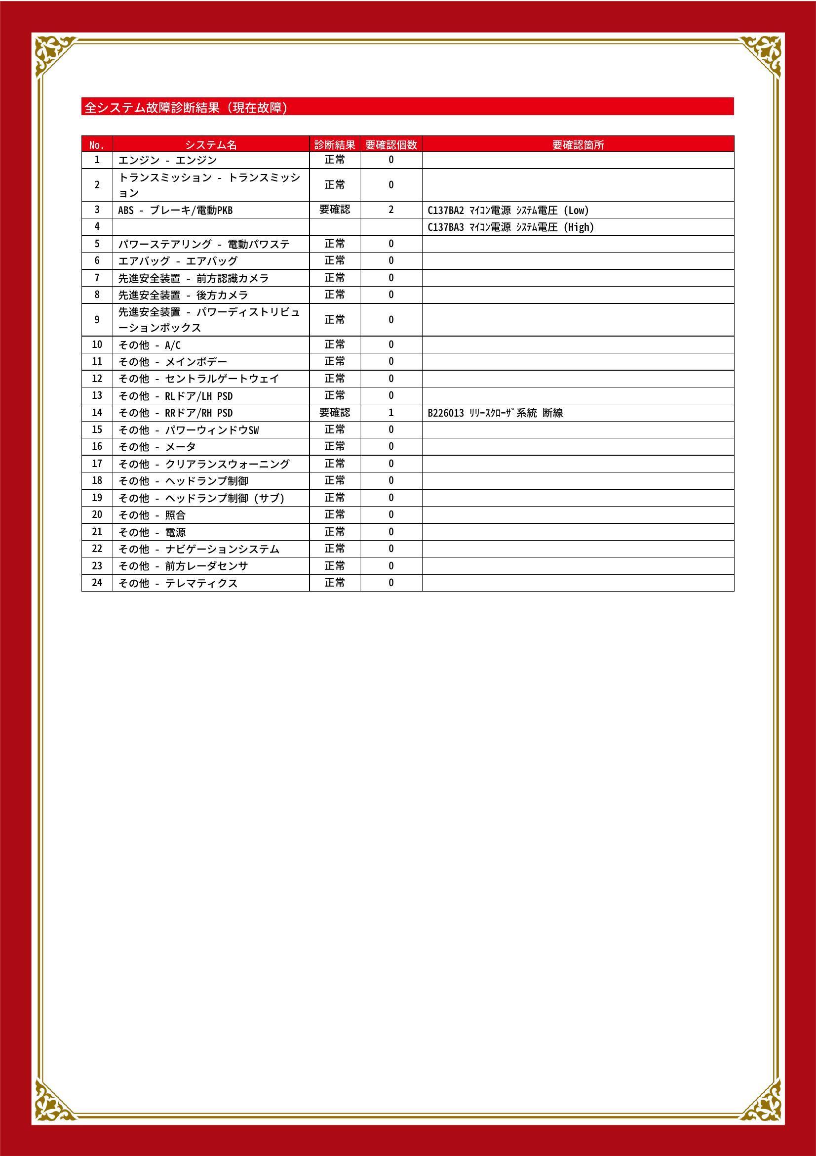 | 保証項目 | 3ヶ月・3000km以内ならエンジン、トランスミッション、ハイブリッド、ステアリング、ブレーキの各機構における主要項目を無償修理(または交換)いたします。 |