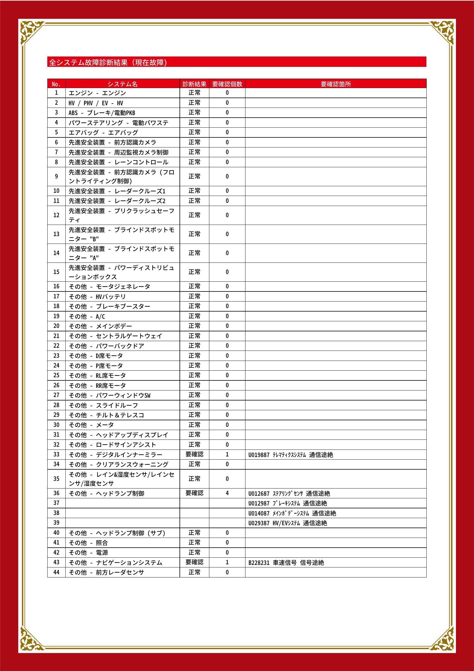 | 保証項目 | 3ヶ月・3000km以内ならエンジン、トランスミッション、ハイブリッド、ステアリング、ブレーキの各機構における主要項目を無償修理(または交換)いたします。 |
