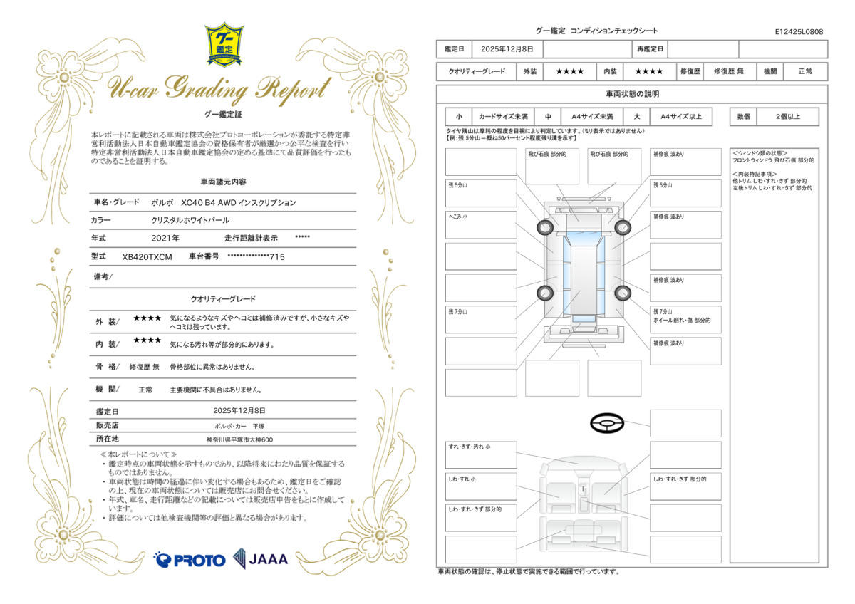 [保証付]:2027(令和9)年7月まで・200000km ※いずれか早い時期が保証適用の条件となります。 走行無制限 ボルボ正規ディーラーだからこその延長可能な、充実の保証プログラム「CHECKED」「PREPARED」「WARRANTY」「ASSISTANCE」という4つの視点から納得の品質を。 |