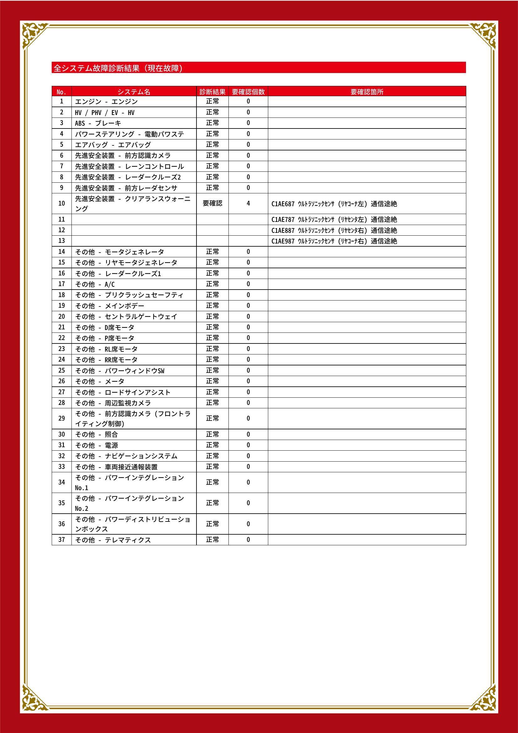 | 保証項目 | 3ヶ月・3000km以内ならエンジン、トランスミッション、ハイブリッド、ステアリング、ブレーキの各機構における主要項目を無償修理(または交換)いたします。 |