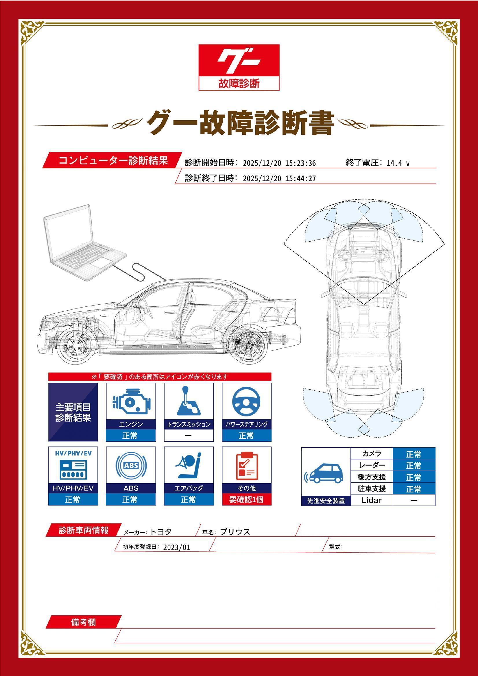 | 保証項目 | 3ヶ月・3000km以内ならエンジン、トランスミッション、ハイブリッド、ステアリング、ブレーキの各機構における主要項目を無償修理(または交換)いたします。 |