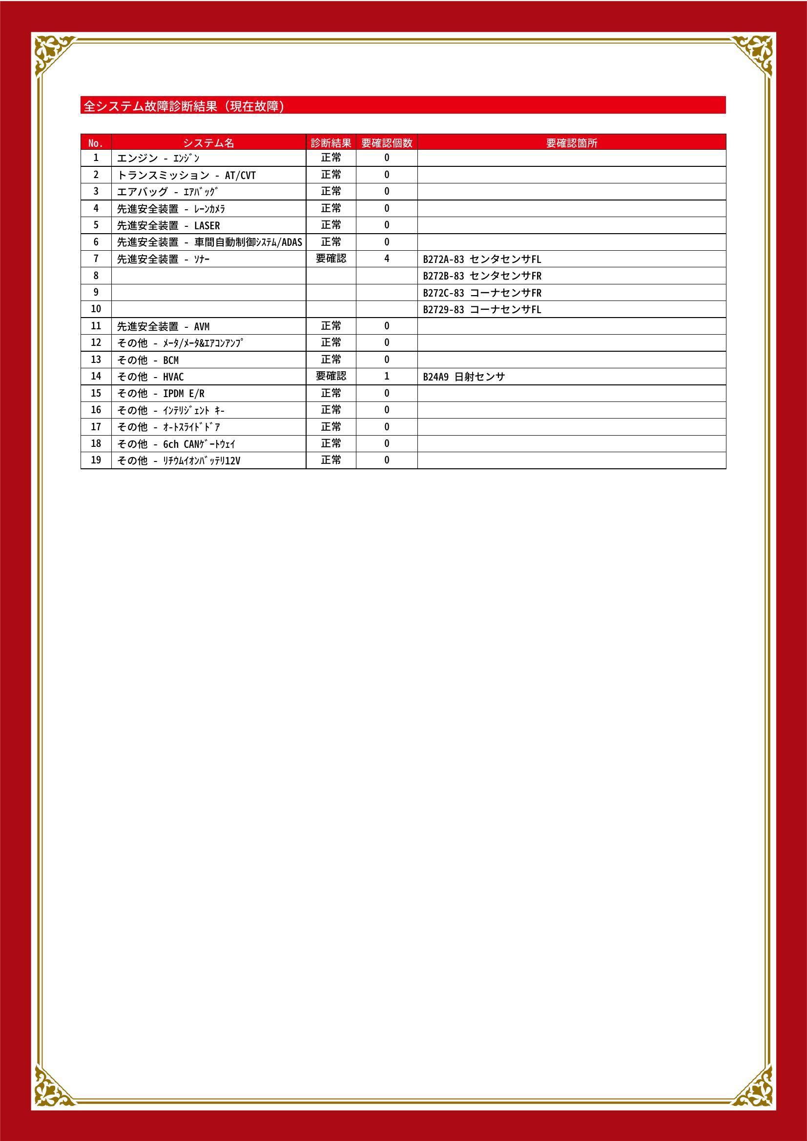 | 保証項目 | 3ヶ月・3000km以内ならエンジン、トランスミッション、ハイブリッド、ステアリング、ブレーキの各機構における主要項目を無償修理(または交換)いたします。 |