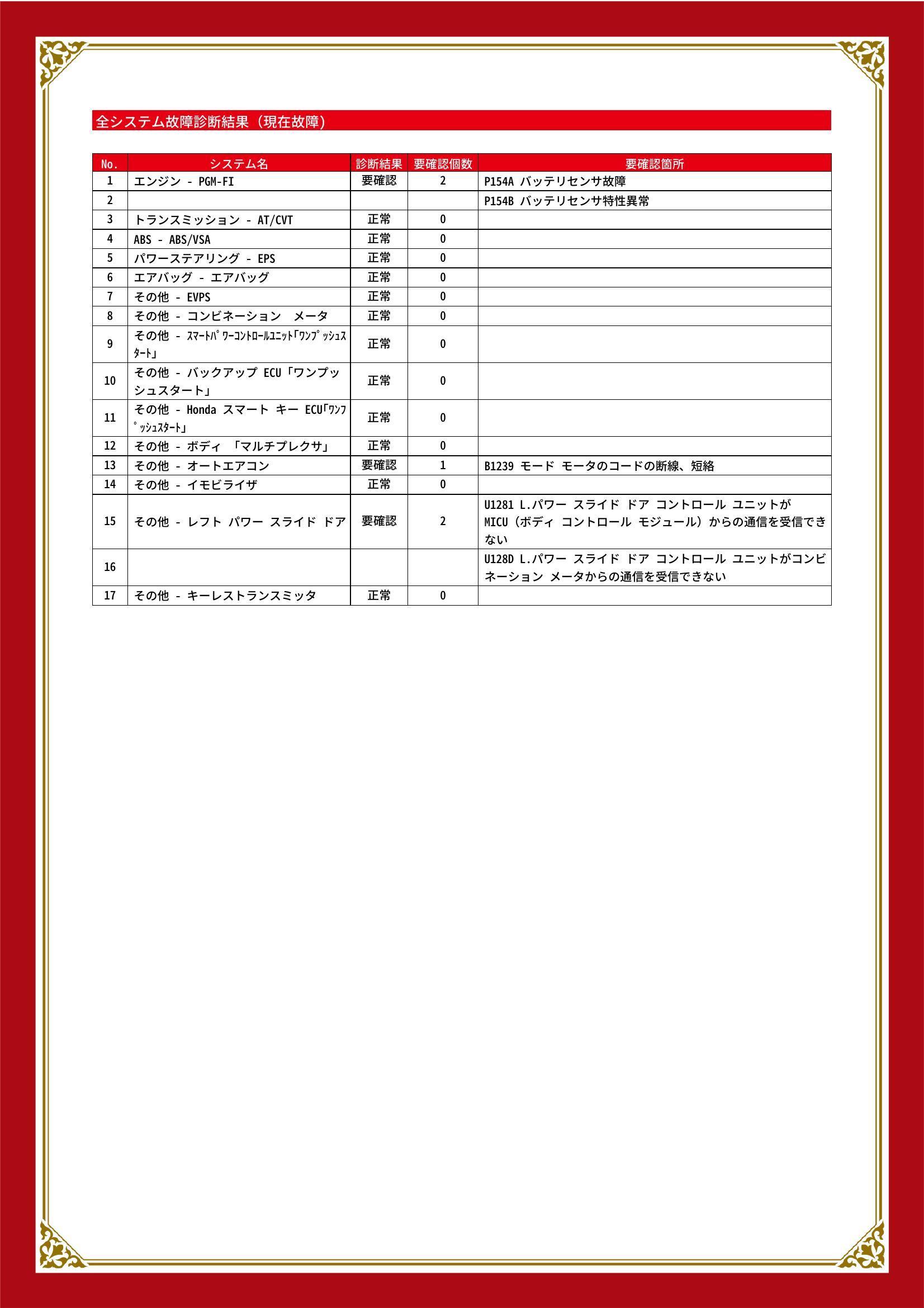 | 保証項目 | 3ヶ月・3000km以内ならエンジン、トランスミッション、ハイブリッド、ステアリング、ブレーキの各機構における主要項目を無償修理(または交換)いたします。 |