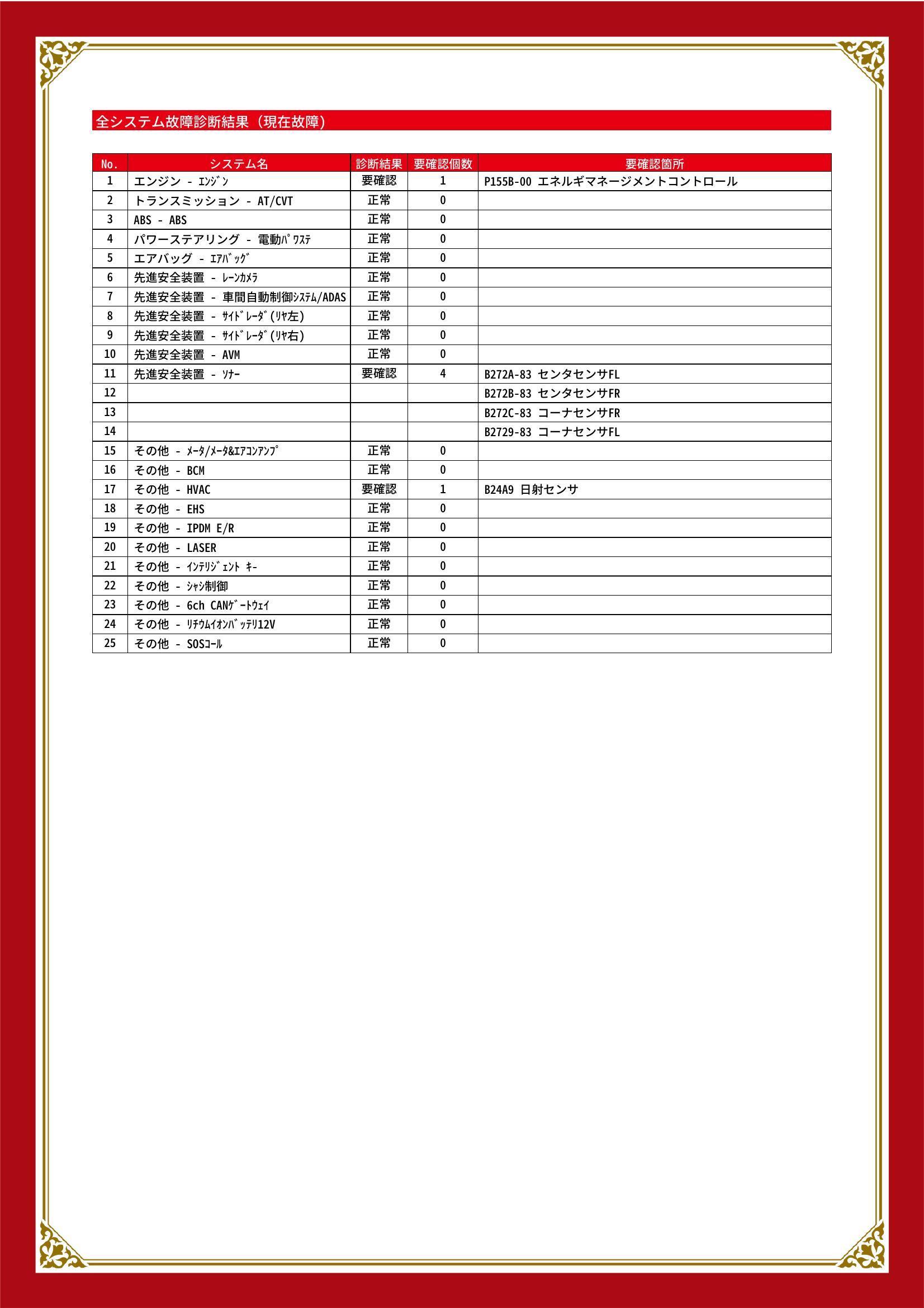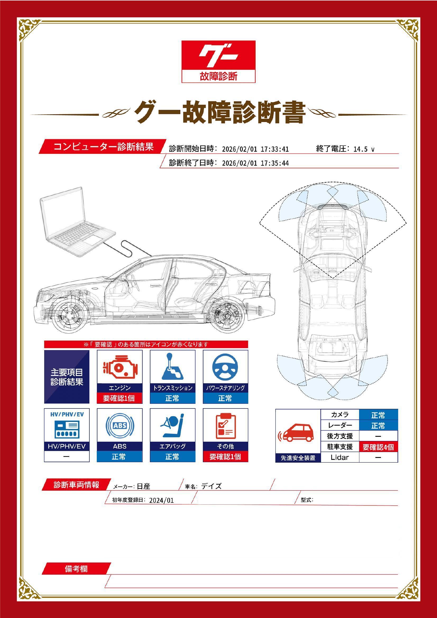 | 保証項目 | 3ヶ月・3000km以内ならエンジン、トランスミッション、ハイブリッド、ステアリング、ブレーキの各機構における主要項目を無償修理(または交換)いたします。 |