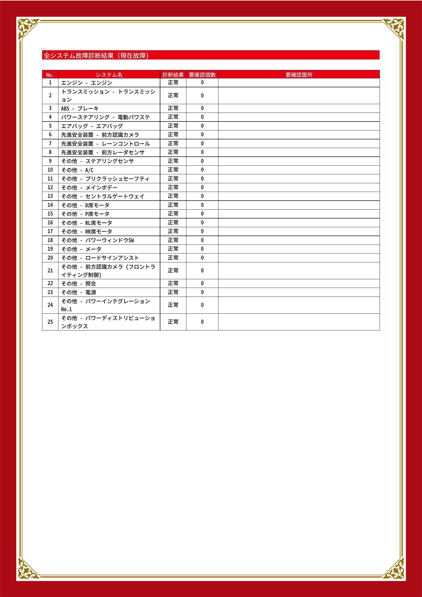 | 保証項目 | 3ヶ月・3000km以内ならエンジン、トランスミッション、ハイブリッド、ステアリング、ブレーキの各機構における主要項目を無償修理(または交換)いたします。 |