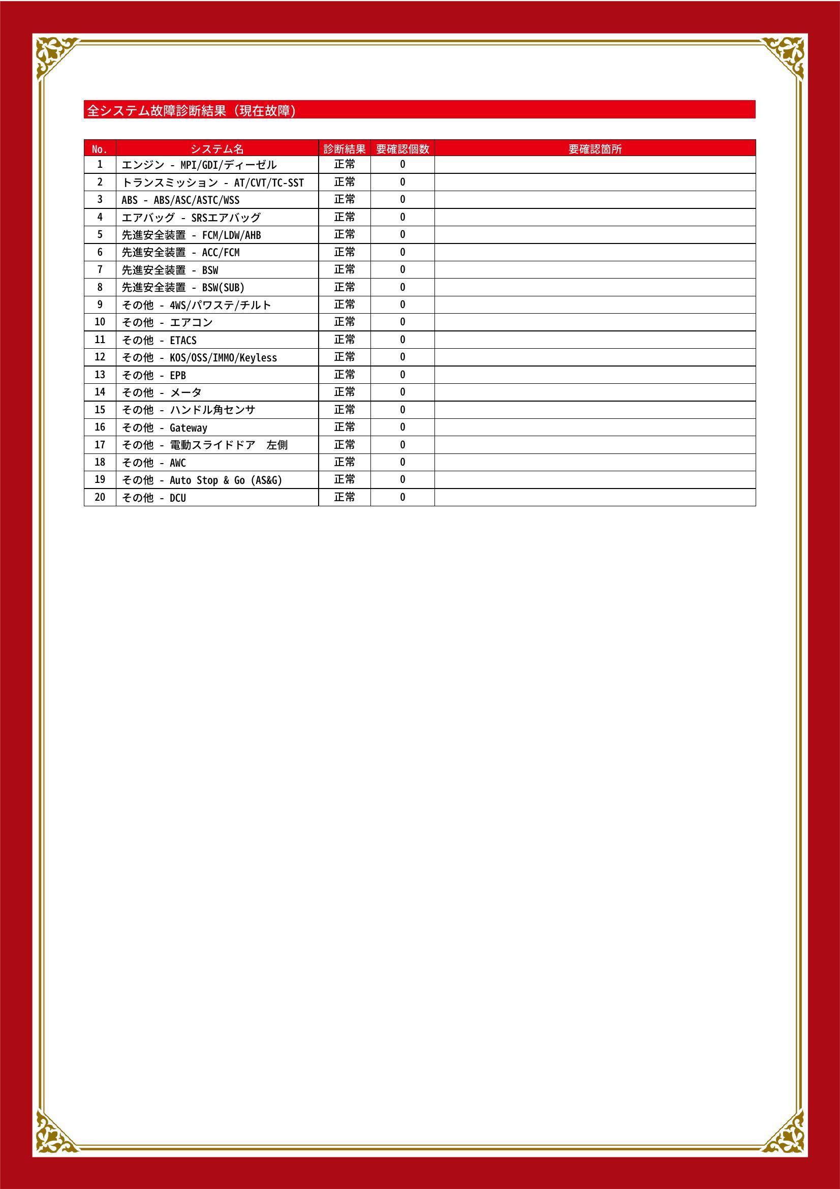 | 保証項目 | 3ヶ月・3000km以内ならエンジン、トランスミッション、ハイブリッド、ステアリング、ブレーキの各機構における主要項目を無償修理(または交換)いたします。 |